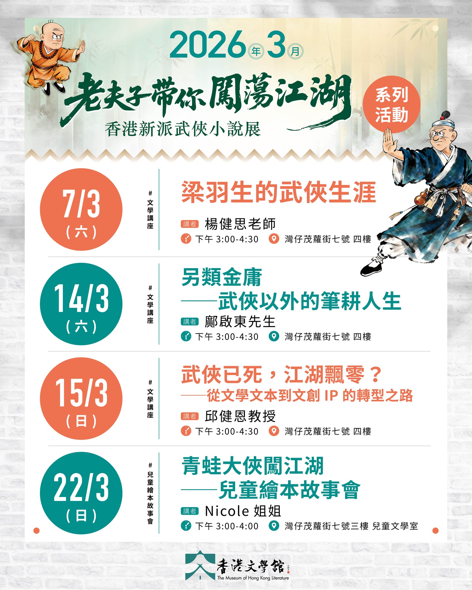 大公文匯全媒體報道,香港文學館現正舉辦「老夫子帶你闖蕩江湖——香港新派武俠小說展」,亦為大家準備了四場精彩的延伸武俠主題活動,由經典文學到親子體驗,老幼咸宜,帶大家一同走進香港新派武俠經典。