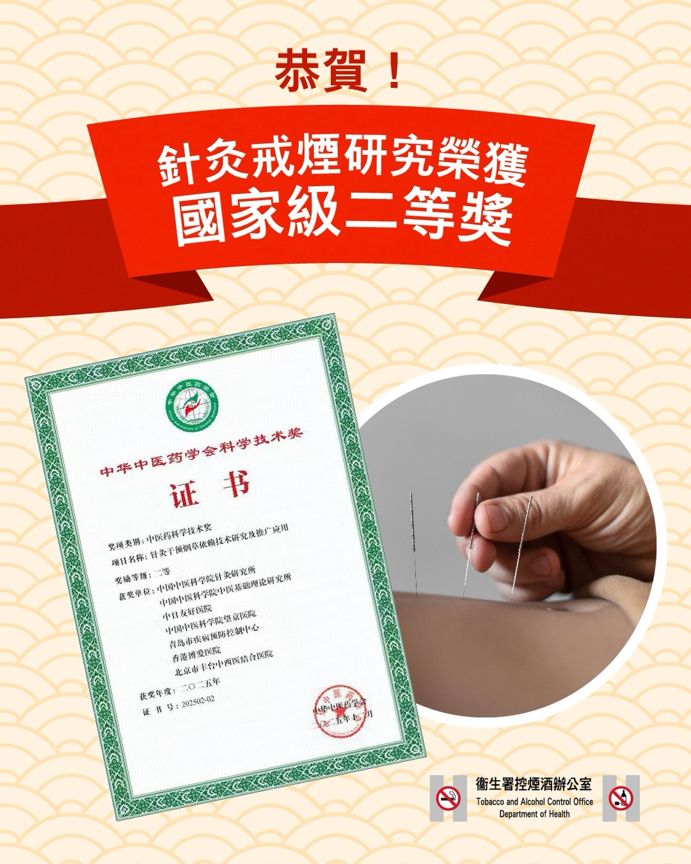 由衞生署推動及資助、香港博愛醫院營辦的「中醫戒煙服務」參與了一項名為 「針灸干預煙草依賴技術研究及推廣應用」的科研項目,該項目最近在中國內地榮獲2025年度「中華中醫藥學會科學技術獎」二等獎。衞生署三月六日致以祝賀,並強調本港的中醫戒煙技術以科學為本,多年來成效顯著,衞生署將繼續與各機構攜手推動結合中西醫的多模式戒煙支援,共建無煙香港。