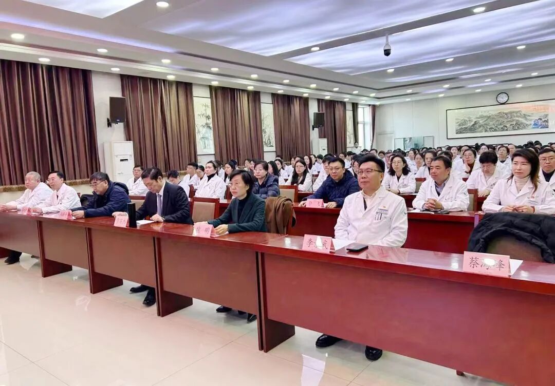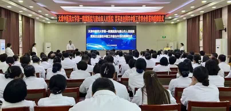 天津中醫藥大學第一附屬醫院首席專家、腫瘤科學術帶頭人、全國名中醫賈英傑教授,唐山市衞生健康委黨組書記、主任魏明,唐山市衞生健康委二級調研員韓新平,唐山市衞生健康委規劃發展與信息化科科長張曉偉,唐山市中醫藥管理局局長李飛,唐山市人民醫院黨委書記李景武,紀委書記董明越,副院長蔡海峰,副院長蘇峰與全院護士長以上中層幹部、職工代表齊聚一堂,共同見證賈英傑全國名中醫工作室簽約授牌。
