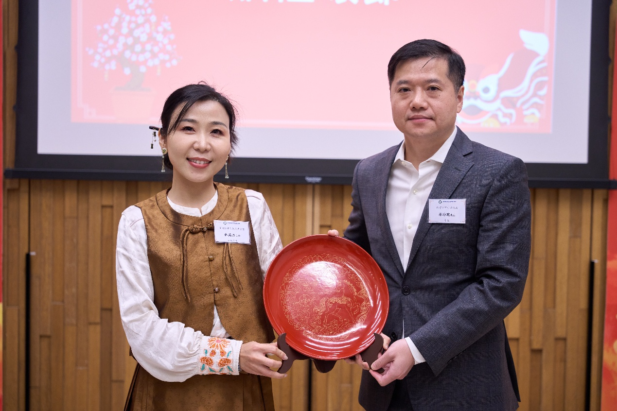 隨後進行的「閩港交融,工藝瑰寶」環節同樣意義非凡,由青創會教育及文體交流委員會顧問、福建羅源灣穀倉畫院鄭世銜院長精心準備了福州傳統工藝瑰寶「大盤漆器」送予青創會。這份珍貴的賀禮由青創會副秘書長林英傑女士代表贈予,並由林培聰會長代表青創會接收,這份厚重情誼不僅展現了傳統文化的魅力,更象徵著閩港兩地科創與文化的深度交融 。