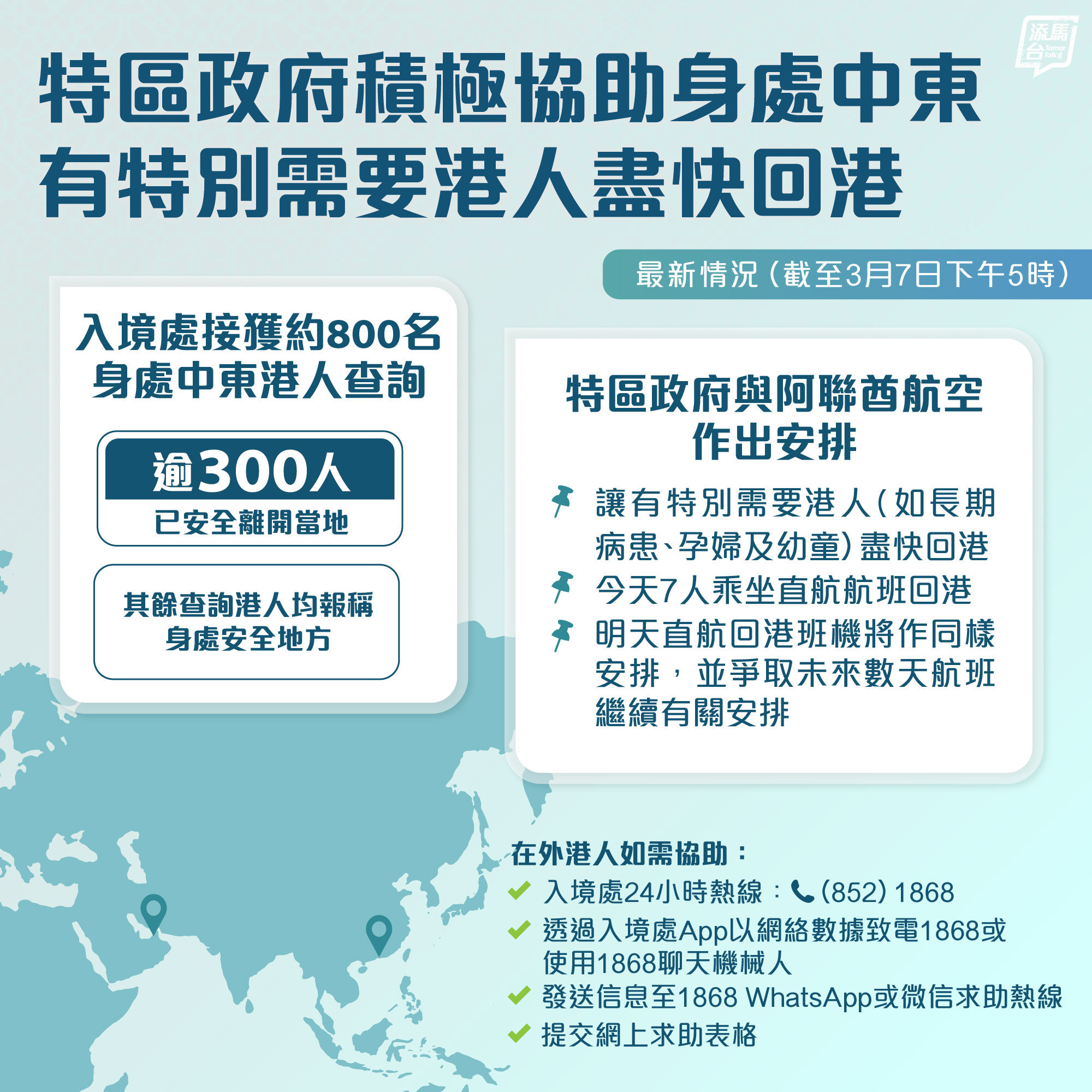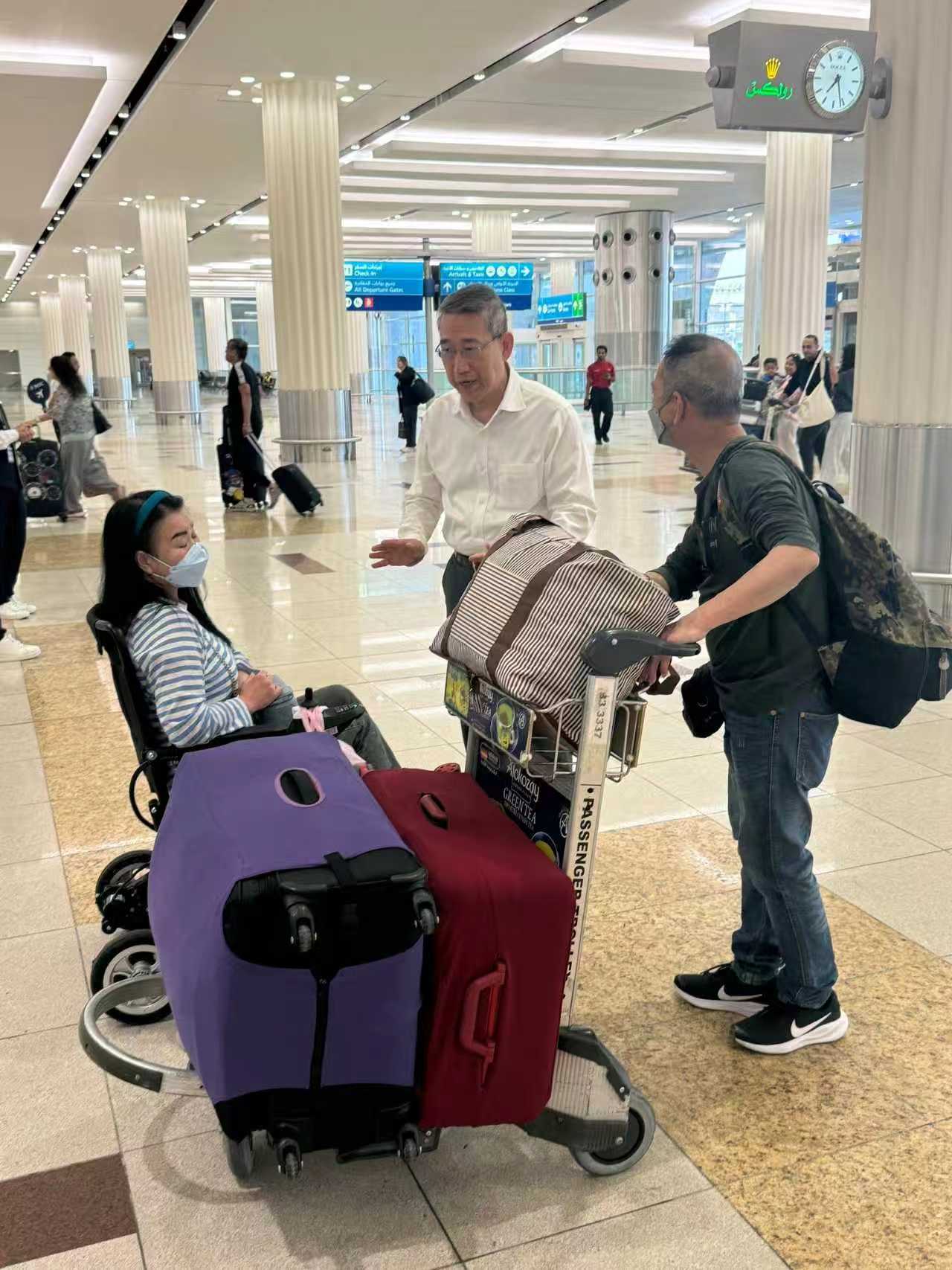 特區政府已與阿聯酋航空作出安排,讓有特別需要(例如長期病患、孕婦及幼童)的港人盡快回港。經駐迪拜經貿辦人員到場支援及協助理順離境安排後,當中7名人士乘坐阿聯酋航空今天直航的航班回港。特區政府會在明天的直航回港班機作同樣安排,亦會爭取在未來數天的航班繼續有關安排。