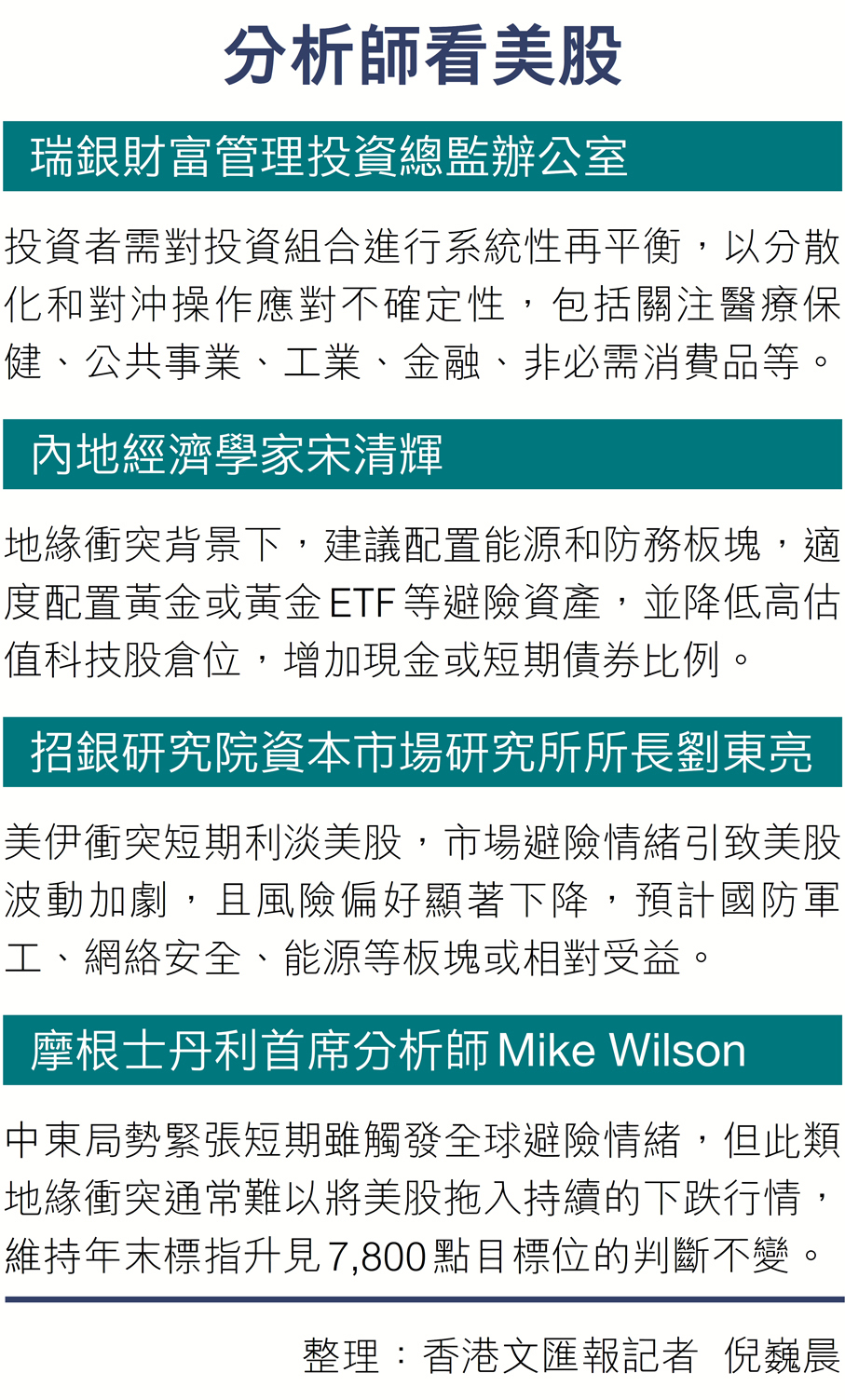 內地經濟學家宋清輝表示,中東緊張局勢升溫推動國際油價上漲,引發通脹預期重燃,而避險情緒的陡升,亦推高全球風險溢價,迫使資金流向避險資產。回溯歷史,地緣衝突事件發生時,能源、軍工等板塊往往走升,高成本的消費、航空等行業通常承壓。他說,美伊衝突短期若進一步升級,美股波動料續上升,資金將從高估值成長股撤出,轉而流向防禦板塊。中長期看,美股走勢有賴於美國的經濟基本面和政策環境,此次衝突最終若未影響到全球能源供應的核心通道,恐慌情緒將逐漸平復,美股大概率呈現「短期震盪、長期回歸基本面」的格局。