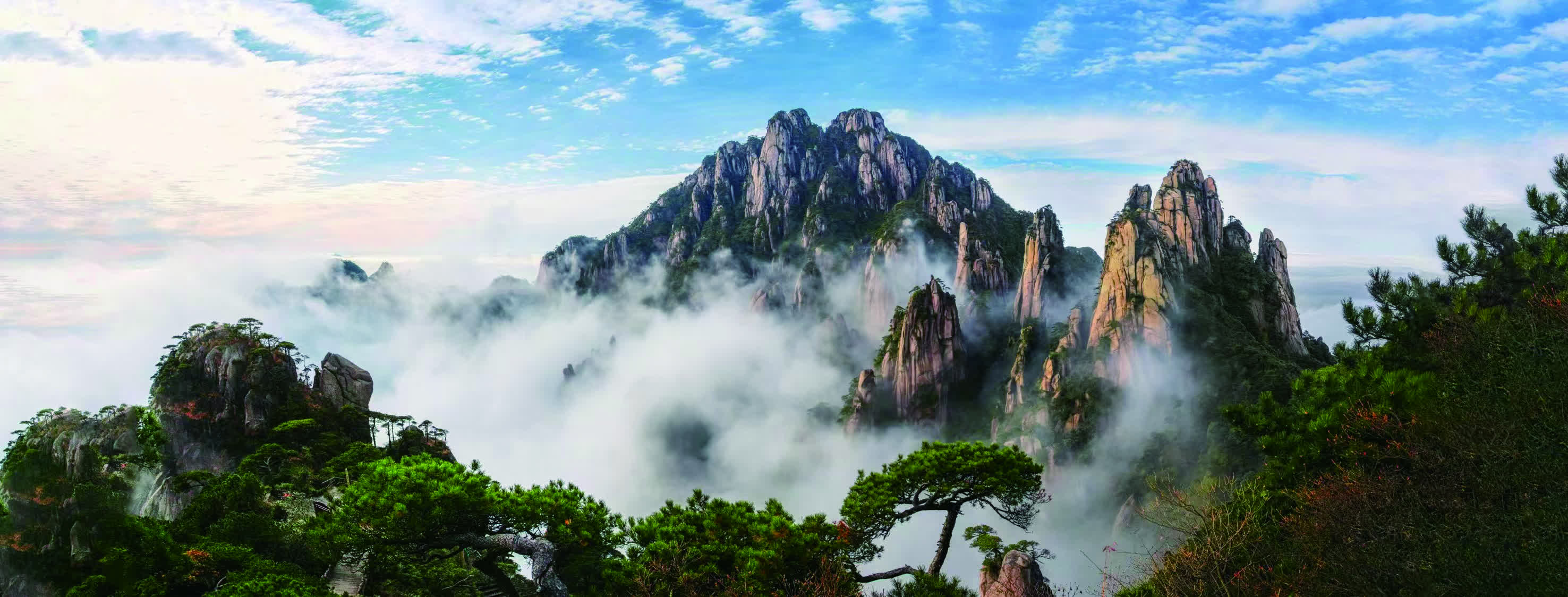 「攬勝遍五嶽,絕景在三清。」三清山境內千峰競秀、萬壑奔流,古樹參天蔽日、珍禽自在棲息;終年雲纏霧繞,彩色瀑布雲與海市蜃樓的奇景偶現其間;被譽為「中國古代道教建築露天博物館」的古建築群錯落分布,更添幾分仙韻……