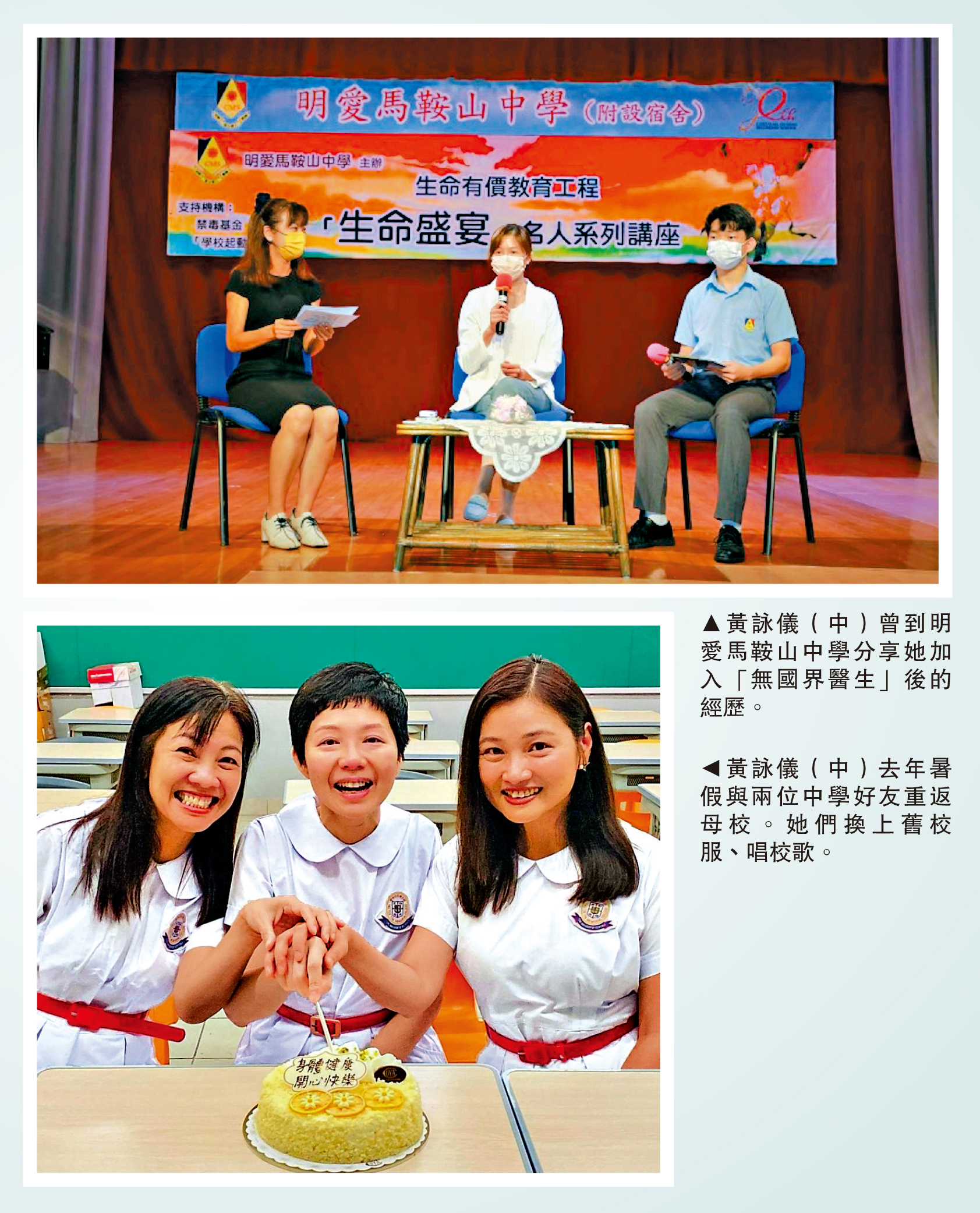黃醫生去年暑假還與兩位中學好友重返母校。她們換上舊校服、唱校歌。她趁此機會分享抗癌經歷與無國界醫生故事,並成立獎學金,勉勵學弟妹自強不息。她的故事,成為無數年輕人追夢的燈塔。