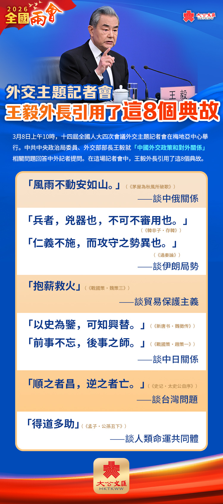 大公文匯網報道,3月8日上午10時,十四屆全國人大四次會議外交主題記者會在梅地亞中心舉行。中共中央政治局委員、外交部長王毅就「中國外交政策和對外關係」相關問題回答中外記者提問。在這場記者會中,王毅外長引用了這8個典故。