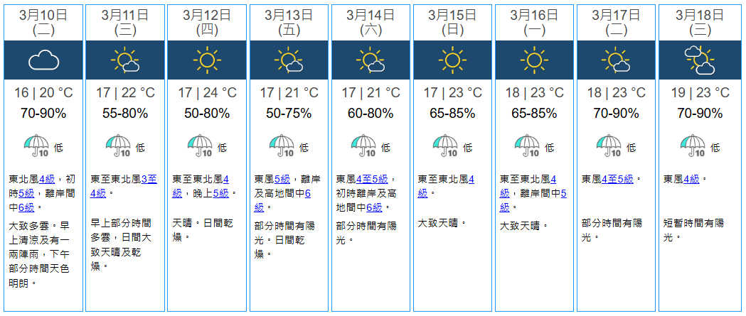 不過,由本周三(3月11日)起天氣逐步好轉,氣溫攀升,其中本周四最高氣溫可達24℃,當日天晴,日間乾燥。不過,受季候風補充影響,本周後期要留意「翻風」,風勢頗大,本周五(3月13日)吹東風5級,離岸及高地間中可達6級。