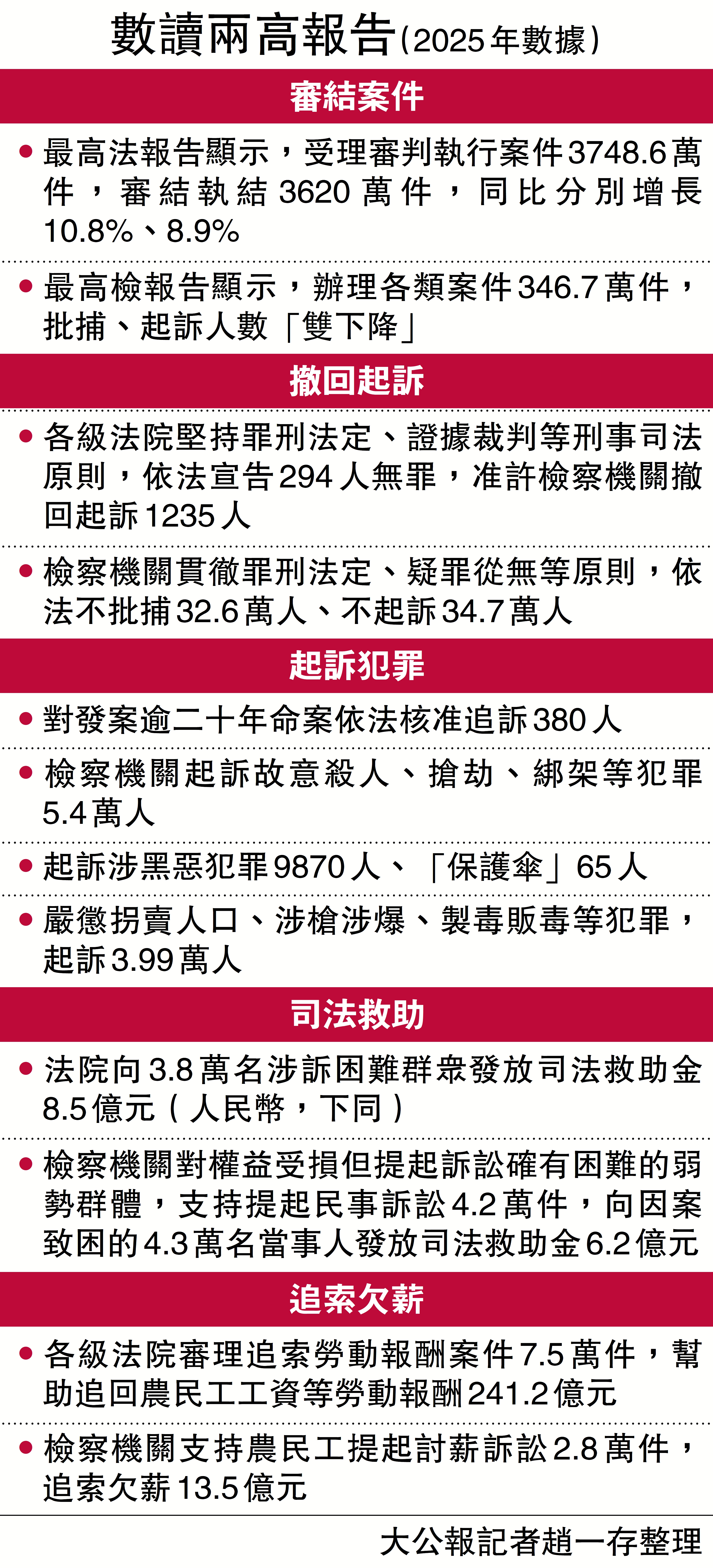 (大公報記者 趙一存 北京報道)十四屆全國人大四次會議9日舉行第二次全體會議,最高人民法院院長張軍與最高人民檢察院檢察長應勇分別作工作報告。緬北「四大家族」犯罪集團寫入兩份報告,其中最高法報告提出,對緬北「四大家族」犯罪集團16名主犯依法判處死刑立即執行,域外侵害我公民犯罪依法必懲;最高檢報告表示針對緬北「四大家族」惡行最高人民檢察院指導對285人提起公訴、從嚴懲處。