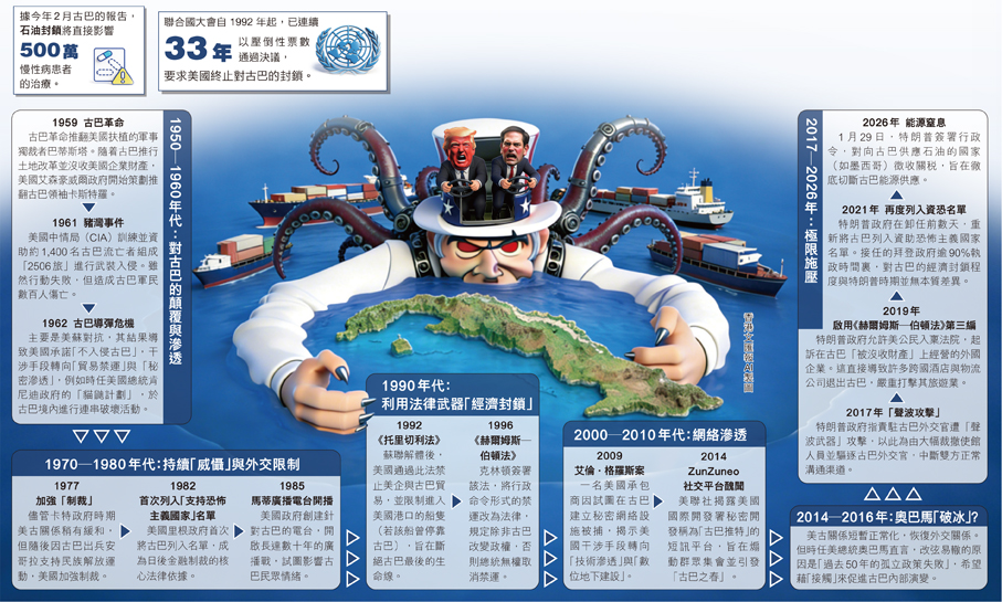 (香港文匯報記者 廖嫣然)美國繼入侵委內瑞拉及襲擊伊朗後,不少分析人士均預計古巴將成為美國總統特朗普下一個目標,謀求將古巴共產政權除之而後快,甚至特朗普也暗示在結束對伊朗軍事行動後將瞄準古巴。而在美古關係持續緊張之際,再因一宗武裝快艇闖境駁火事件而火上澆油。古巴政府通報,一艘在美國佛羅里達州註冊的快艇2月25日非法闖入其中部海域,並向執行核查的公務人員開火,古方部隊還擊,當場打死4人。事發後,美國國務卿魯比奧迅速否認有任何政府人員參與其中,強調並非美方的行動,但同時指古巴的現狀「不可持續」,需徹底改變。