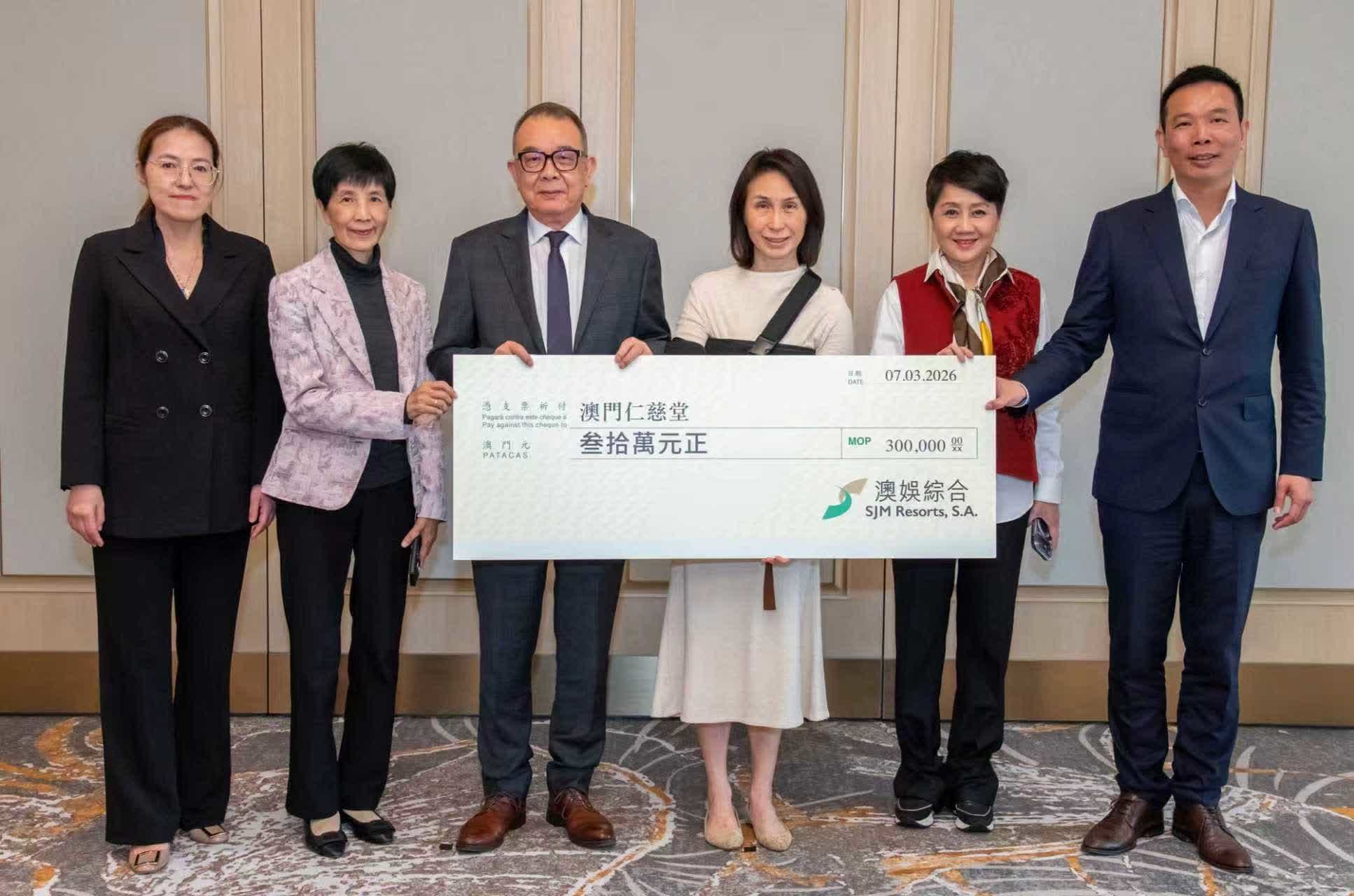 在日前舉行的捐贈儀式上,澳娛綜合常務董事何超鳳代表公司致送善款支票,澳門仁慈堂值理會主席飛安達代表接受。出席嘉賓包括澳娛綜合董事兼員工福利諮詢委員會主席梁安琪,以及受惠機構代表——澳門工會聯合總會監事長何雪卿、澳門街坊總會理事長陳家良及澳門仁慈堂秘書長盧茜儀。