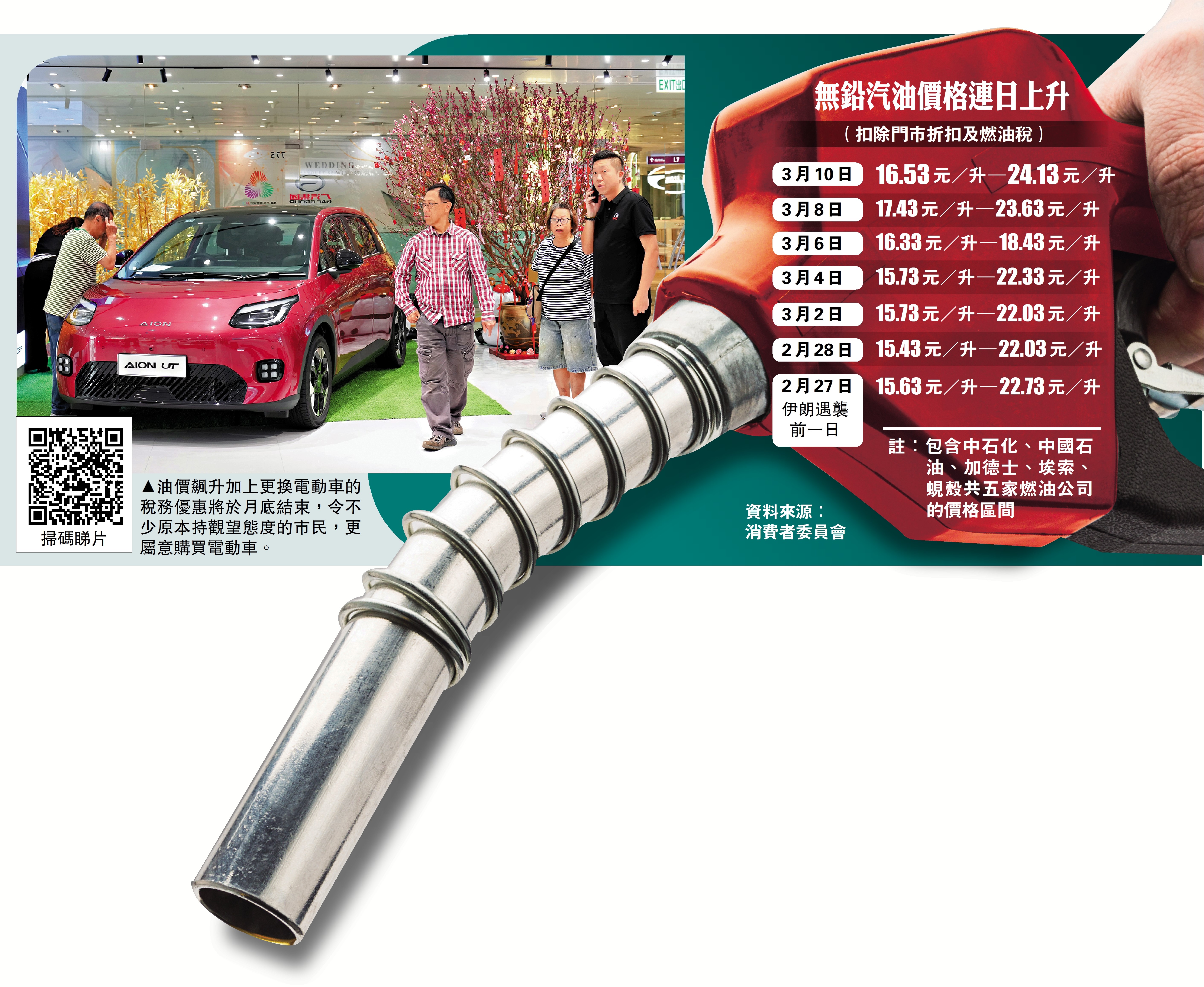 近期中東戰局持續緊張,帶動國際油價節節攀升,香港也無法幸免,昨日各油站汽油零售價已升穿每公升30元。消委會油價資訊通網頁資料顯示,在伊朗受襲前一天(2月27日),本港五間油公司每公升無鉛汽油油價,扣除門市折扣及燃油稅後,介乎15.63至22.73元之間,至前日(3月10日)共11日期間,五間油公司各加價三至四次、升到16.53至24.13元,加幅約為5.4%至8.4%。