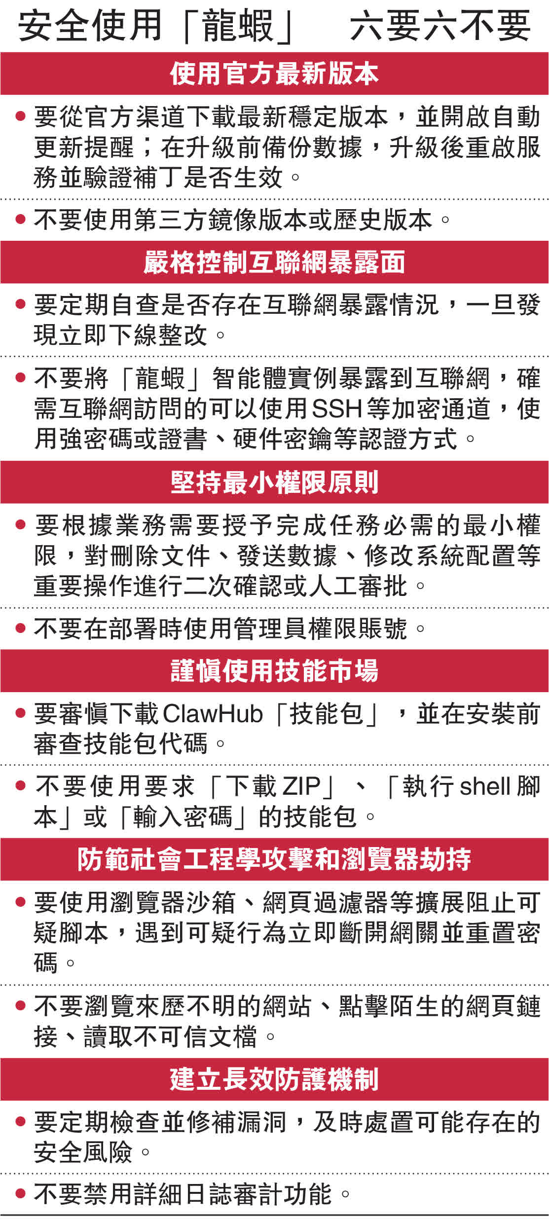此外,工信部對於「龍蝦」給出「六要六不要」的安全使用建議,包括使用官方最新版本,嚴格控制互聯網暴露面,堅持最小權限原則,謹慎使用技能市場,防範社會工程學攻擊和瀏覽器劫持,同時建立長效防護機制。