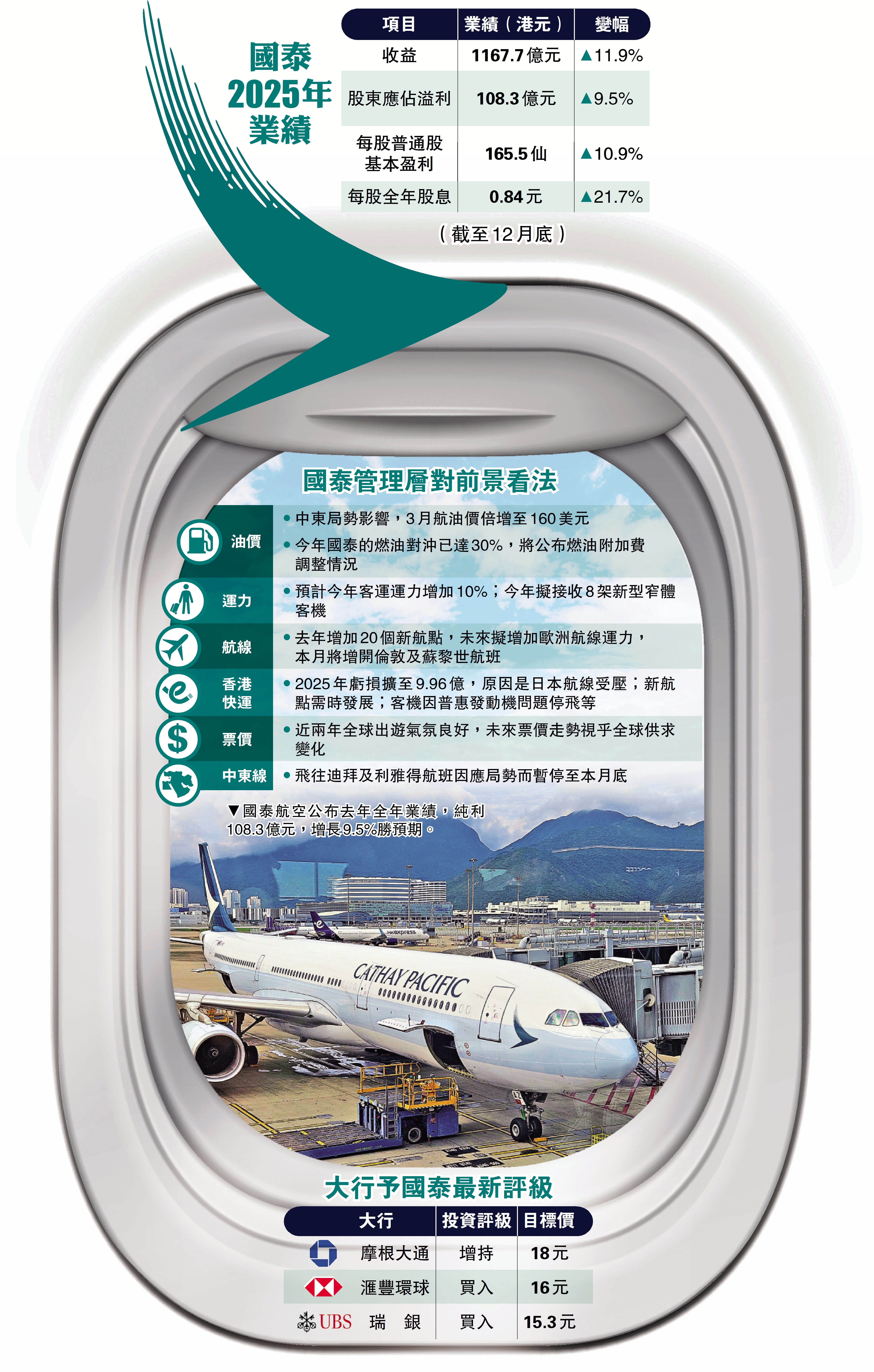 國泰行政總裁林紹波指出,中東局勢對國泰整體業務影響有限,惟3月航空燃油價格較1月及2月平均水平倍增至160美元,公司將盡快就上調燃油附加費公布具體情況。他並提到,公司在全球逾100個航點當中,超過20個位於內地,未來將繼續同步發展內地和國際航線,進一步強化香港「背靠祖國、聯通世界」的國際航空樞紐地位。