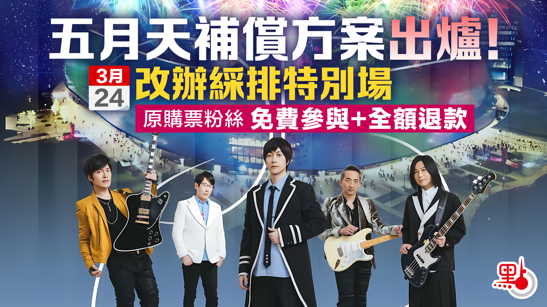 大公文匯全媒體報道,今年是台灣天團「五月天」成團29周年,早前宣布於本月來港在啟德主場館舉行演唱會,原定於3月24、25、27、28日舉行,然而主辦方突然取消3月24日場次,改為於3月29日「加場」,並向購買了本月24日門票的觀眾退款。消息一出,大批網民大呼失望,有人認為主辦方於取飛前一日才公布很過分,感到不被尊重。主辦方於昨晚(11日)在社交平台發聲明,指將安排購入3月24日門票觀眾免入場觀看40分鐘的綵排「特別場」,並指對已購票觀眾深表抱歉。