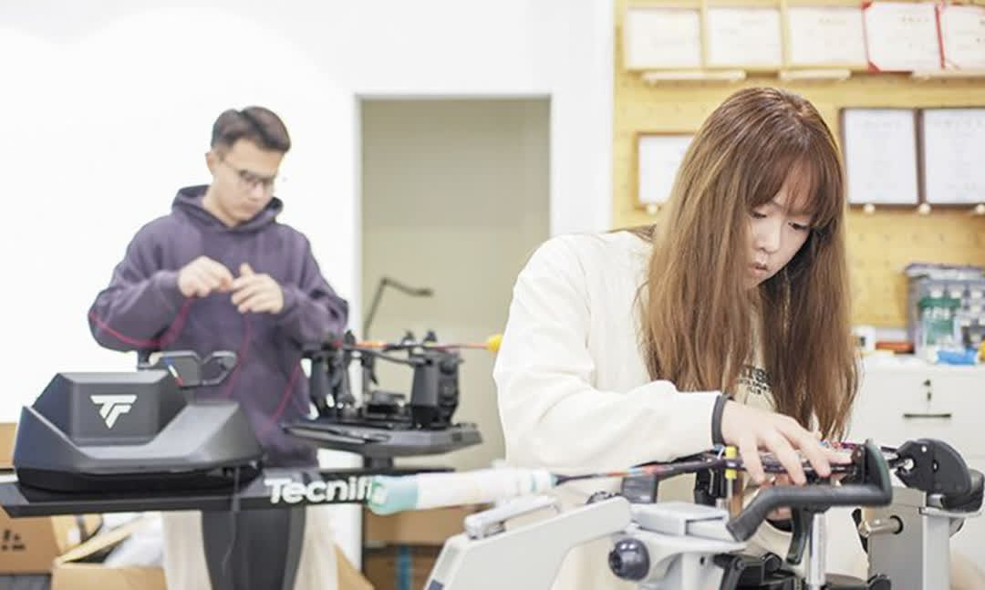 「我們不約而同選擇來長沙讀書,在校園裏相遇相識相知,這種緣分很奇妙。」陳廣美笑着回憶初識場景,他們在湘江畔的校園裏找到了共鳴。隨着找黃銘煒穿線的球友越來越多,陳廣美自然成了他的「最佳搭檔」——遞工具、理線材、記訂單,逐漸地,她開始站在穿線機前,跟着黃銘煒學習那門能賦予球拍生命的手藝。