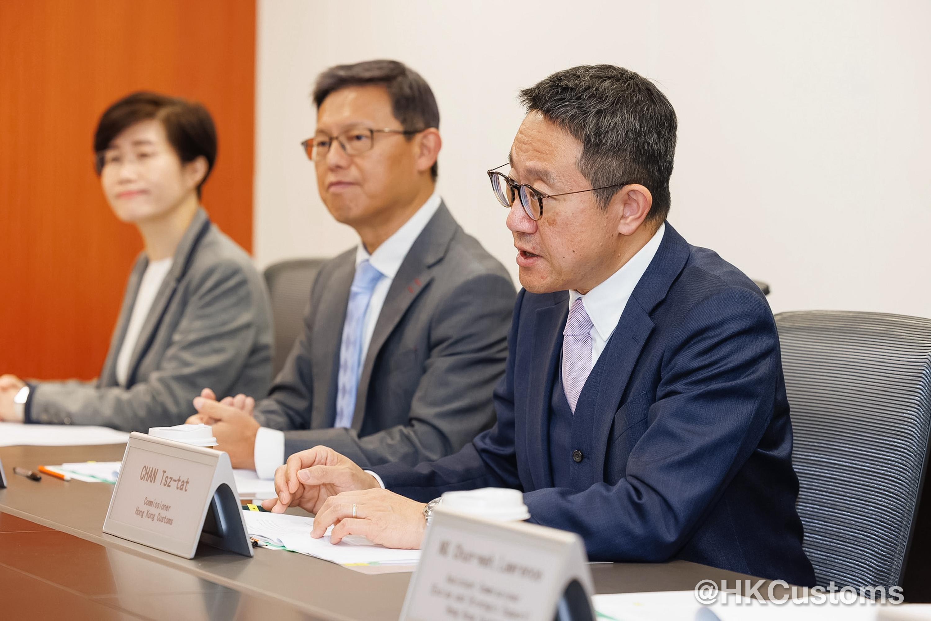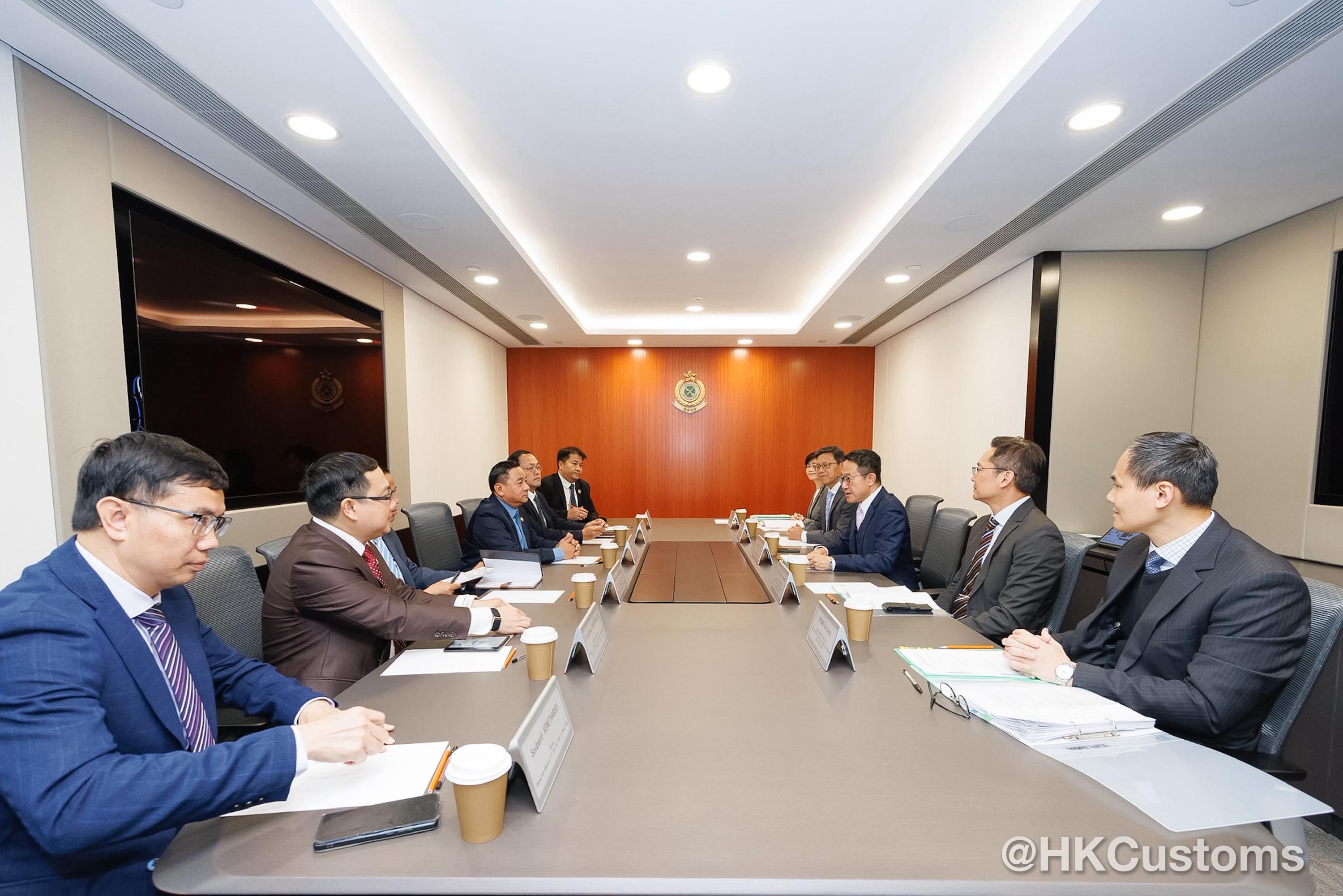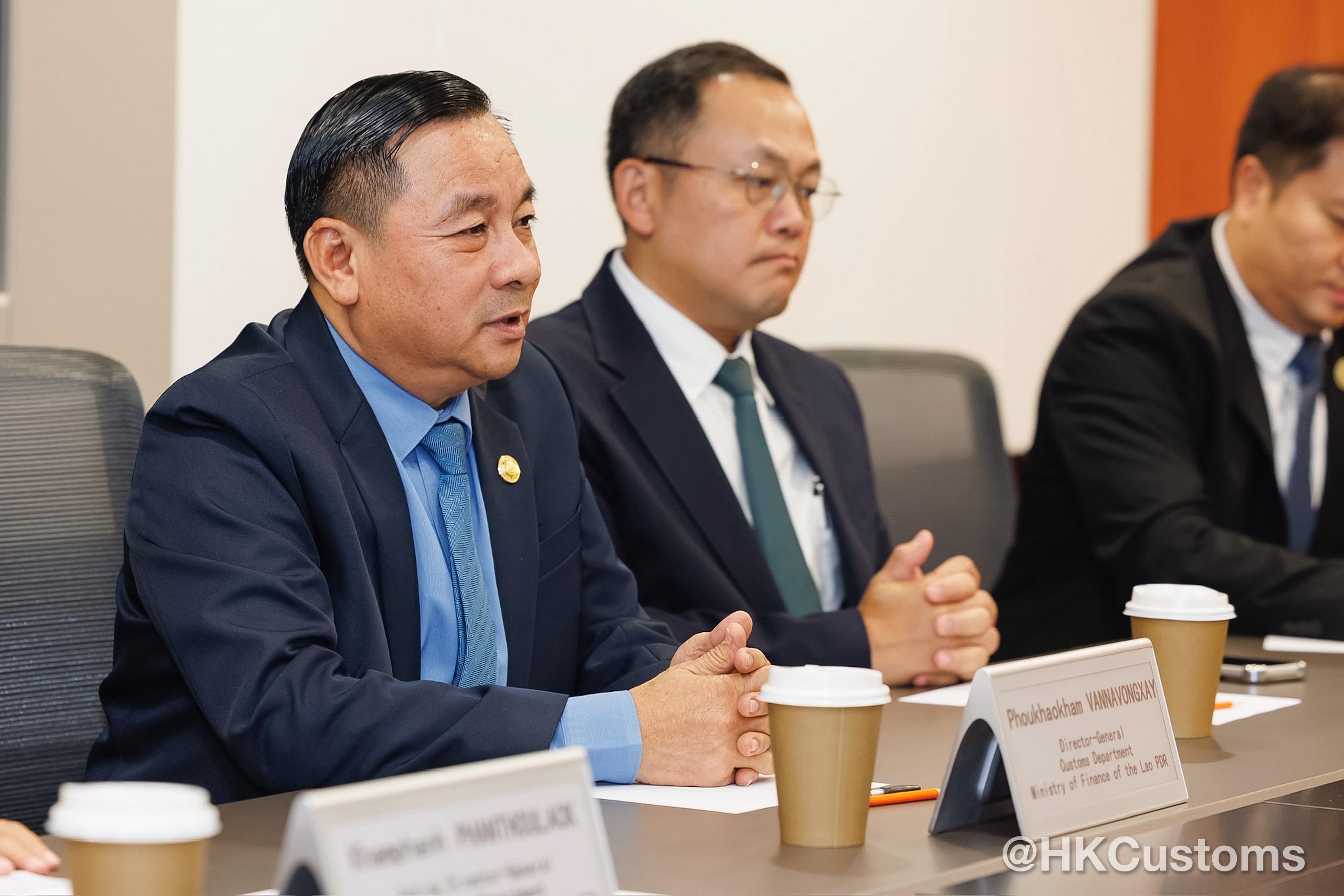 陳子達歡迎Phoukhaokham Vannavongxay及代表團成員到訪香港海關。會面期間,香港海關分享了香港作為國際貿易中心,在智慧海關建設方面的發展及應課稅品管制方面的工作和經驗。雙方亦就便商利貿等多個共同關注的議題交流討論。