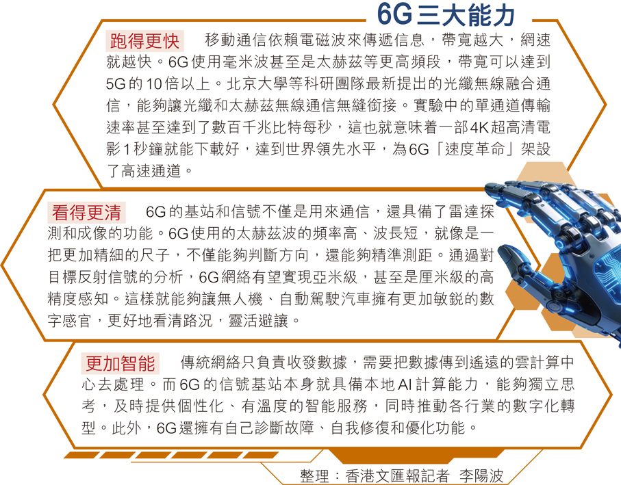 (香港文匯報記者 李陽波 兩會報道)「十五五」規劃中明確提出將深化拓展「人工智能+」,加強人工智能與6G等領域技術協同創新,充分發揮數智技術和數據要素對豐富人民生活、改善民生福祉的作用。內地社交平台上,「6G網要來了」話題持續多日位居熱搜榜前列,不少網友暢想起使用6G網後的便捷和暢快。