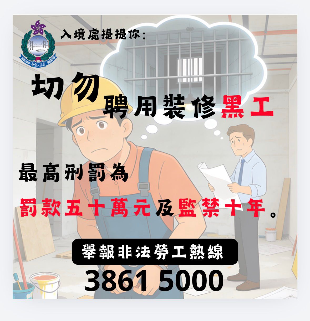 入境處提醒各位市民,切勿貪小便宜聘請裝修黑工,聘請非法勞工是嚴重罪行,一經定罪最高可罰款50萬及監禁10年。如果市民發現可疑非法勞工,記得致電舉報非法勞工專線3861 5000,把不法分子繩之於法。