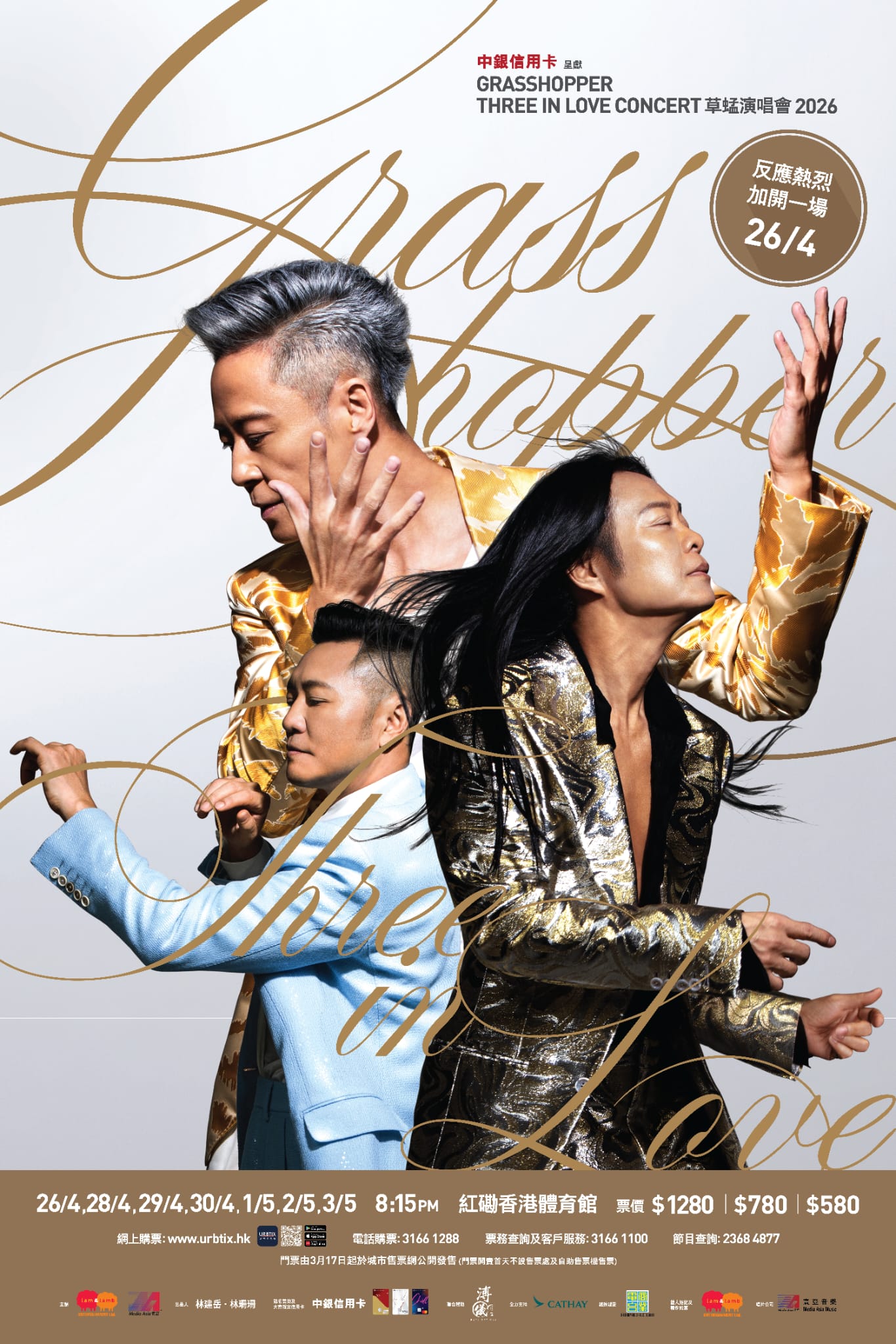 (大公文匯全媒體特約記者 陳惠芳)草蜢將於2026年4月28日至5月3日在紅館舉行一連六場「Grasshopper Three In Love演唱會」,慶祝成軍40周年。因反應熱烈,草蜢今日(13日)宣布加開4月26日一場,3月17日在城市售票網公開發售。即日起銅鑼灣SOGO大型LED屏幕會播放宣傳片,Fans可以前去打卡。