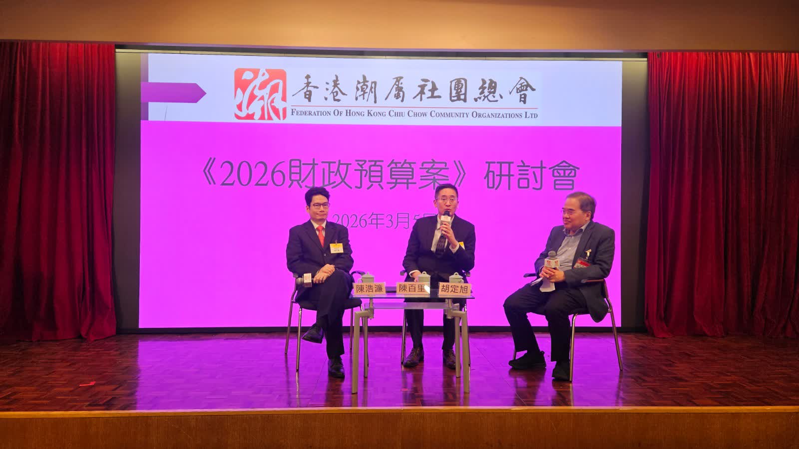 日前,由香港潮屬社團總會主辦的2026財政預算案研討會在潮州會館十樓大禮堂圓滿舉辦,特邀商務及經濟發展局副局長陳百里和財經事務及庫務局副局長陳浩濂擔任主講嘉賓,分別從商務經濟、財經庫務領域,對財政司司長陳茂波發表的2026至27年度《財政預算案》作出權威解讀,為與會者精準拆解發展路徑、明晰政策支持方向。香港潮屬社團總會主席胡定旭出席致歡迎辭,永遠名譽主席許學之,常務副主席胡炎松,副主席張仲哲、李志強、林國良、黃家豪、黃詠霖等與常務會董、會董、青委、婦委及各屬會成員等一同出席。
