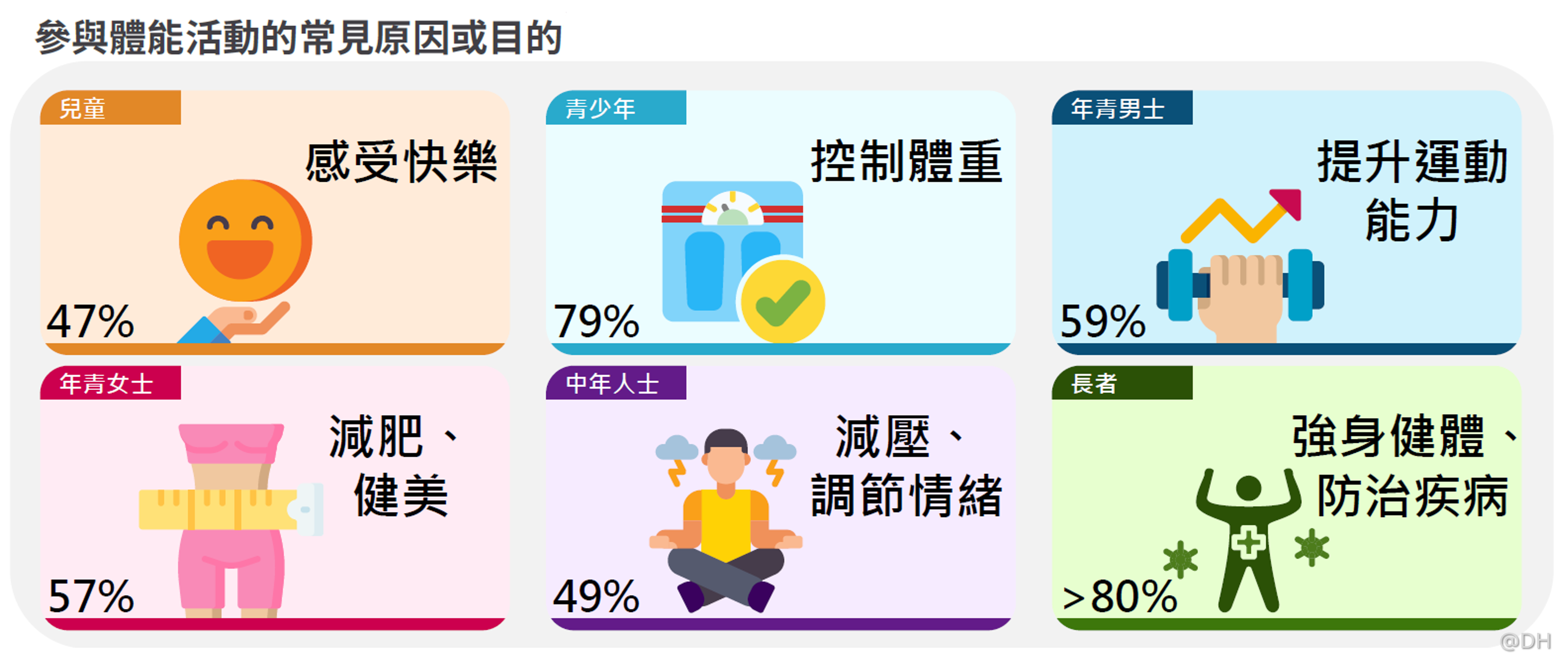 香港約有750萬居民,每人也有動起來的理由。調查顯示,本地居民參與體能活動的原因包括控制體重、強身健體、感受快樂、防治疾病、減壓或調節情緒等。