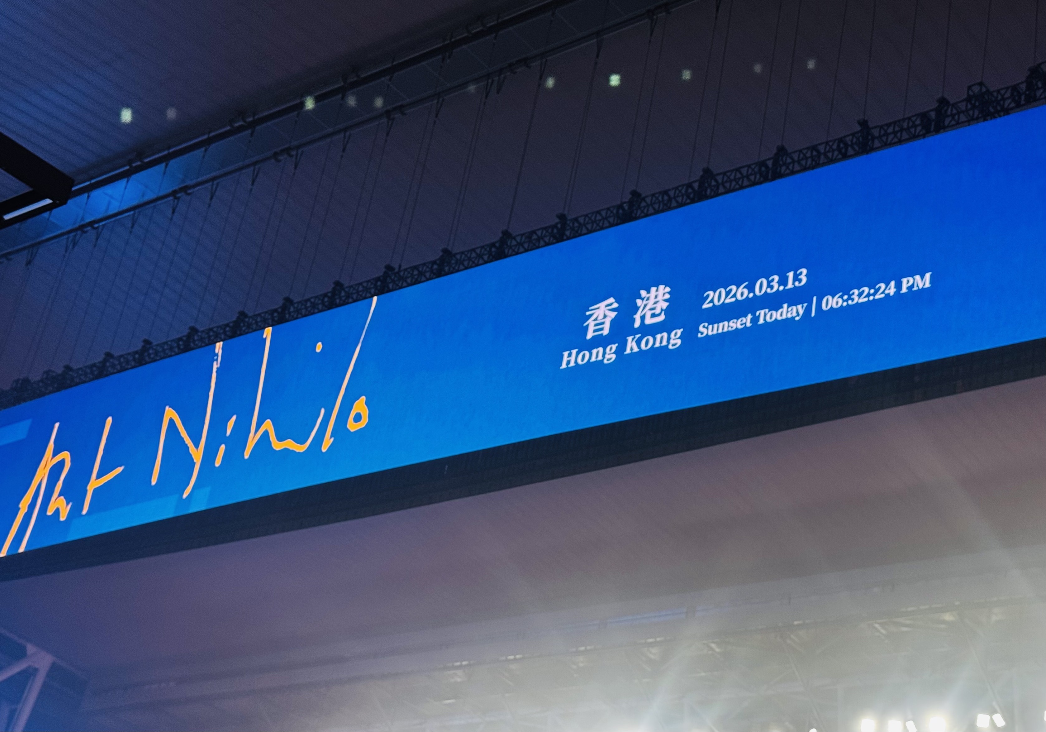 值得留意的是,今次演唱會啟德主場館正中央的特大屏幕上,定格顯示今日(3月13日)的日落時間是下午6時32分24秒」,呼應演唱會主題《就在日落以後》,別具心思,為今晚的演出增添浪漫氛圍。