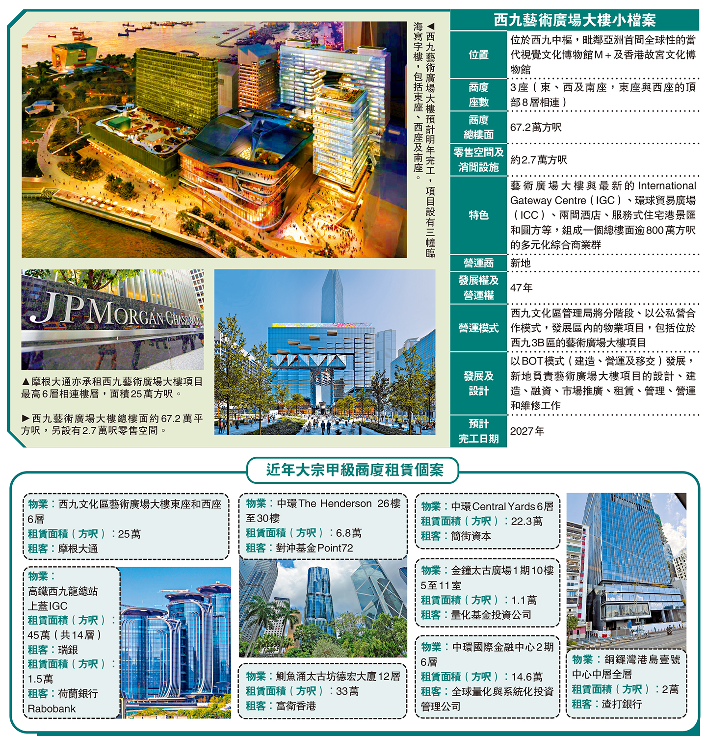 新地於2022年投得西九藝術廣場大樓的發展權及營運權,預計於2027年完工,項目設有3幢臨海寫字樓,包括東座、西座及南座,總樓面約67.2萬平方呎,另設約2.7萬呎零售空間,東座與西座的頂部8層相連,摩根大通將租用最高的6層。
