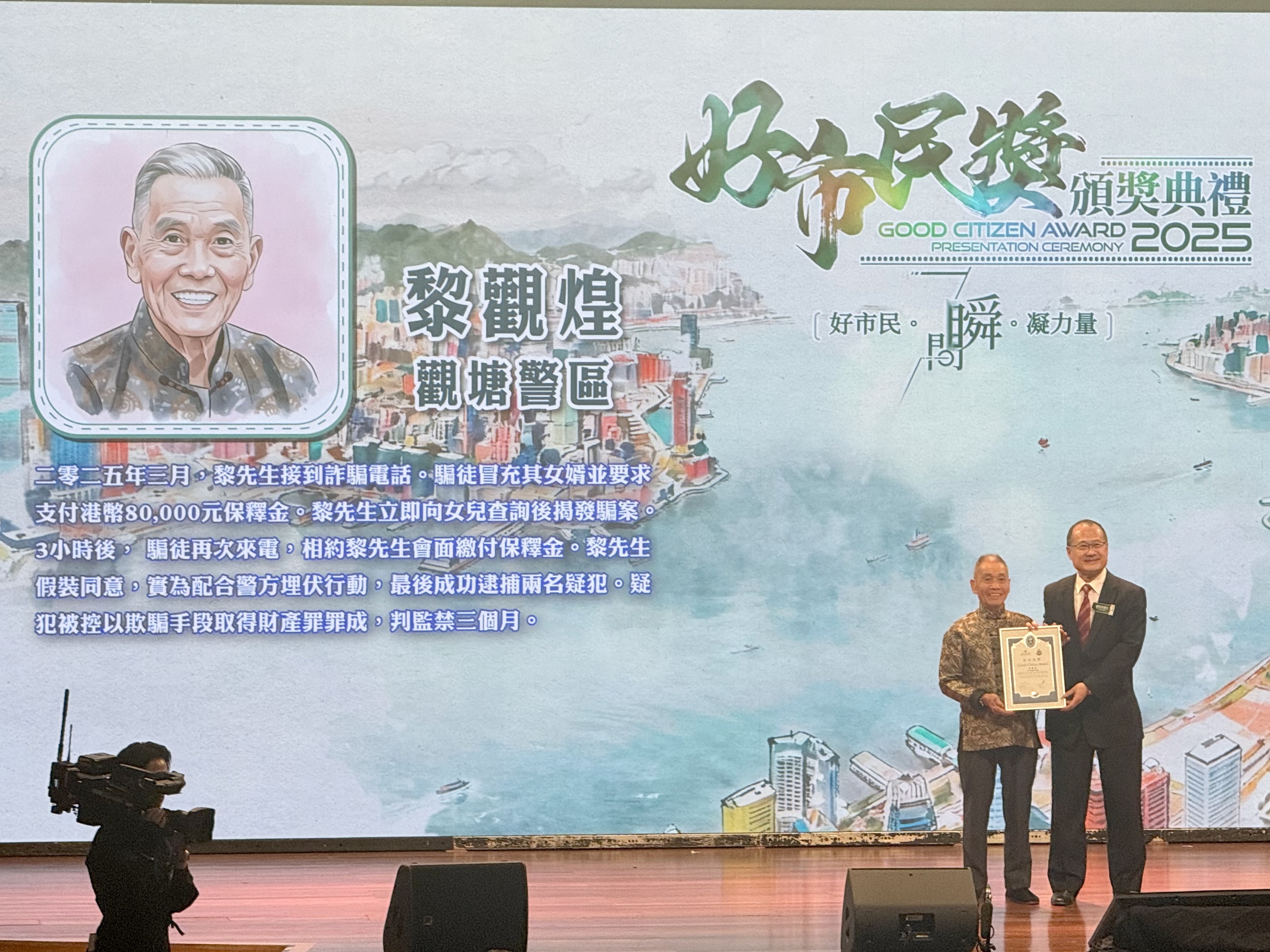 (大公文匯全媒體 記者 周禹含)「好市民獎頒獎典禮2025」今日(14日)假會展中心舉行,嘉許80名協助警方撲滅罪行的好市民,並表揚協助警方推動防騙滅罪工作的6間機構。