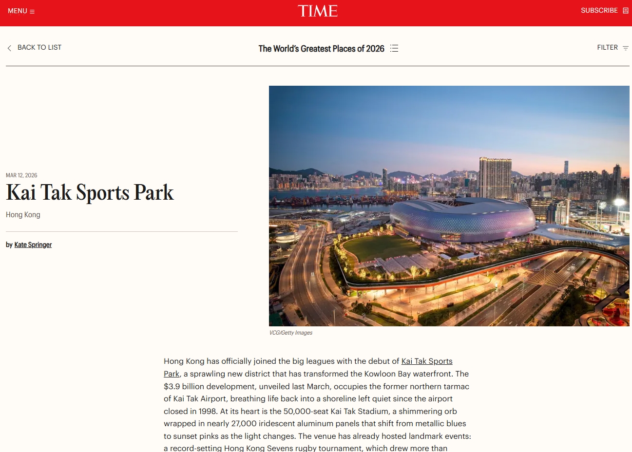 大公文匯全媒體報道,啟德體育園獲《時代雜誌》選為「全球最佳勝地」之一,成為榜單中唯一入選的香港景點。《時代雜誌》形容啟德體育園為機場關閉後的沉寂海岸線注入活力,過去舉辦多場運動和娛樂活動,進一步鞏固香港作為體育和娛樂中心的地位。