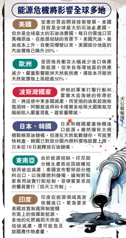 大公報綜合《華爾街日報》、《金融時報》報道,中東戰火持續超過兩周,導致霍爾木茲海峽運輸停滯,大量船隻無法通過。最新航運數據顯示,從3月1日至今,霍爾木茲海峽的船隻通航數量暴跌94%。該海峽的「梗阻」不僅造成全球能源價格飆升,預計很快影響物流、工業製造及農業生產等領域,將對全球經濟產生連鎖反應。供應鏈危機所造成產品價格升高和短缺,直接影響消費者。