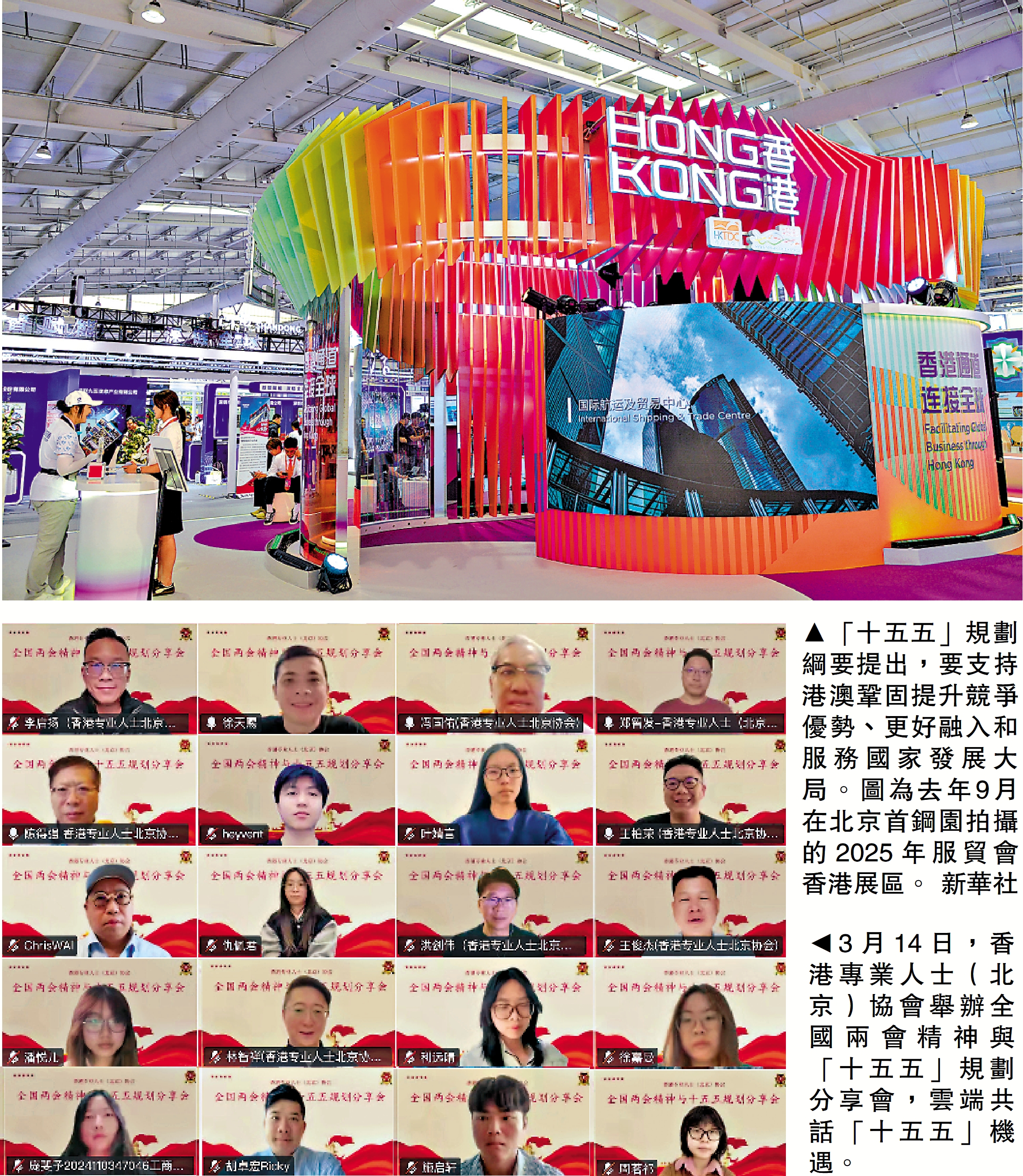 (大公報記者 張寶峰 北京報道)3月14日,香港專業人士(北京)協會舉辦全國兩會精神與「十五五」規劃分享會,約100名來自金融、科創、法律、教育、傳媒、體育等不同領域的香港專業人士,以及在北京多所高校就讀的香港青年學子齊聚一堂,雲端共話「十五五」機遇、共商香港融入國家發展大局之策。