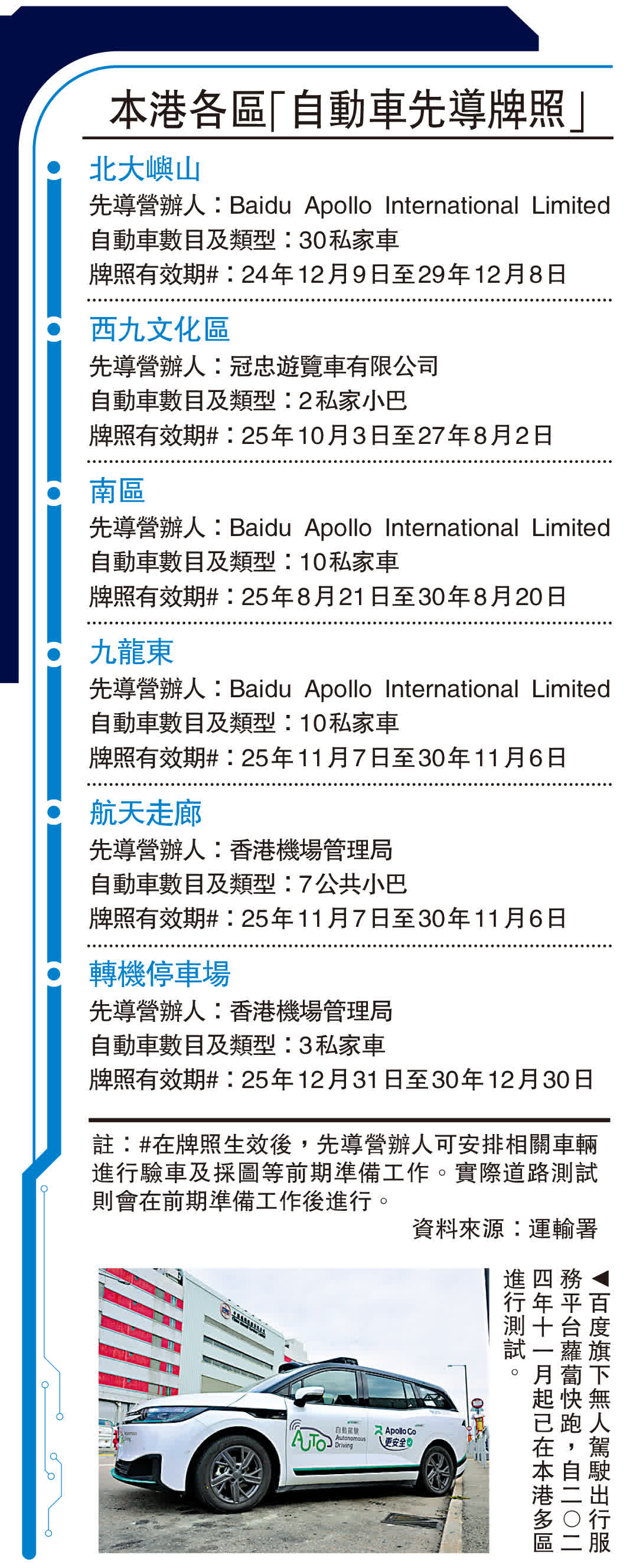 陳美寶昨日在相關活動上致辭提到本港自動駕駛應用進度時表示,運輸署成立的自動駕駛車輛應用促進工作組將於下周舉行首次會議。現時本港已有60架自動駕駛車輛在不同區域穿梭測試,包括從機場到西九文化區、從數碼港到啟德等。「最近,北大嶼山的測試路段由機場島大幅延伸至東涌市中心及欣澳,包括的路程長達43公里。」