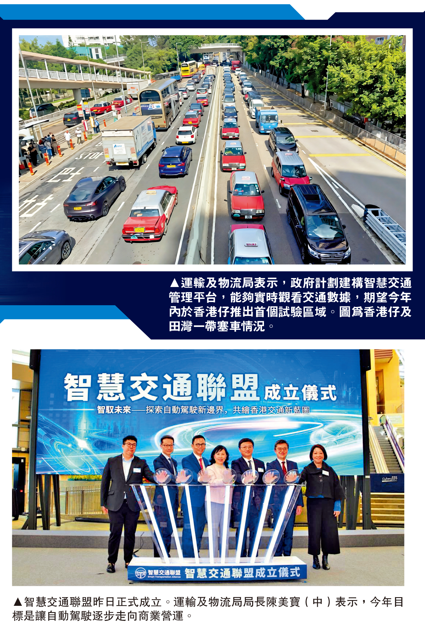 運輸及物流局局長陳美寶指出,運輸署已先後批准60輛自動駕駛車輛在全港不同區域測試,目標今年內推動自動駕駛由試驗邁向規模化及商業營運。另外,借助大數據和人工智能技術,當局計劃年內在香港仔試推智慧「交通管理平台」。
