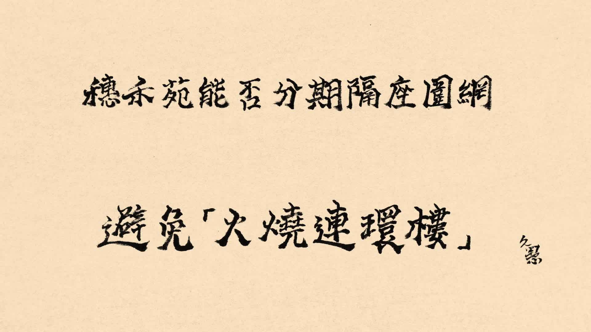 第四,宏福苑大火發生翌日,已經有一名女士致電電台,稱曾擔任業主立案法團職務,自家屋苑大維修時,選擇分期進行,有效避免了「火燒連環樓」。到了該月30日,時任工程界立法會議員盧偉國亦公開強調,未來不應該一次過將多幢大廈圍起進行維修,而應分期逐幢進行,減低火災風險。這近乎常識的建議,為何至今未被採納?為何仍未有具體立法措施,規管大維修工程須分期進行?特別是穗禾苑此類距離近的大廈,應該實施「隔座圍網」,一座圍了網,相連那一座就不圍,避免火乘風勢蔓延。