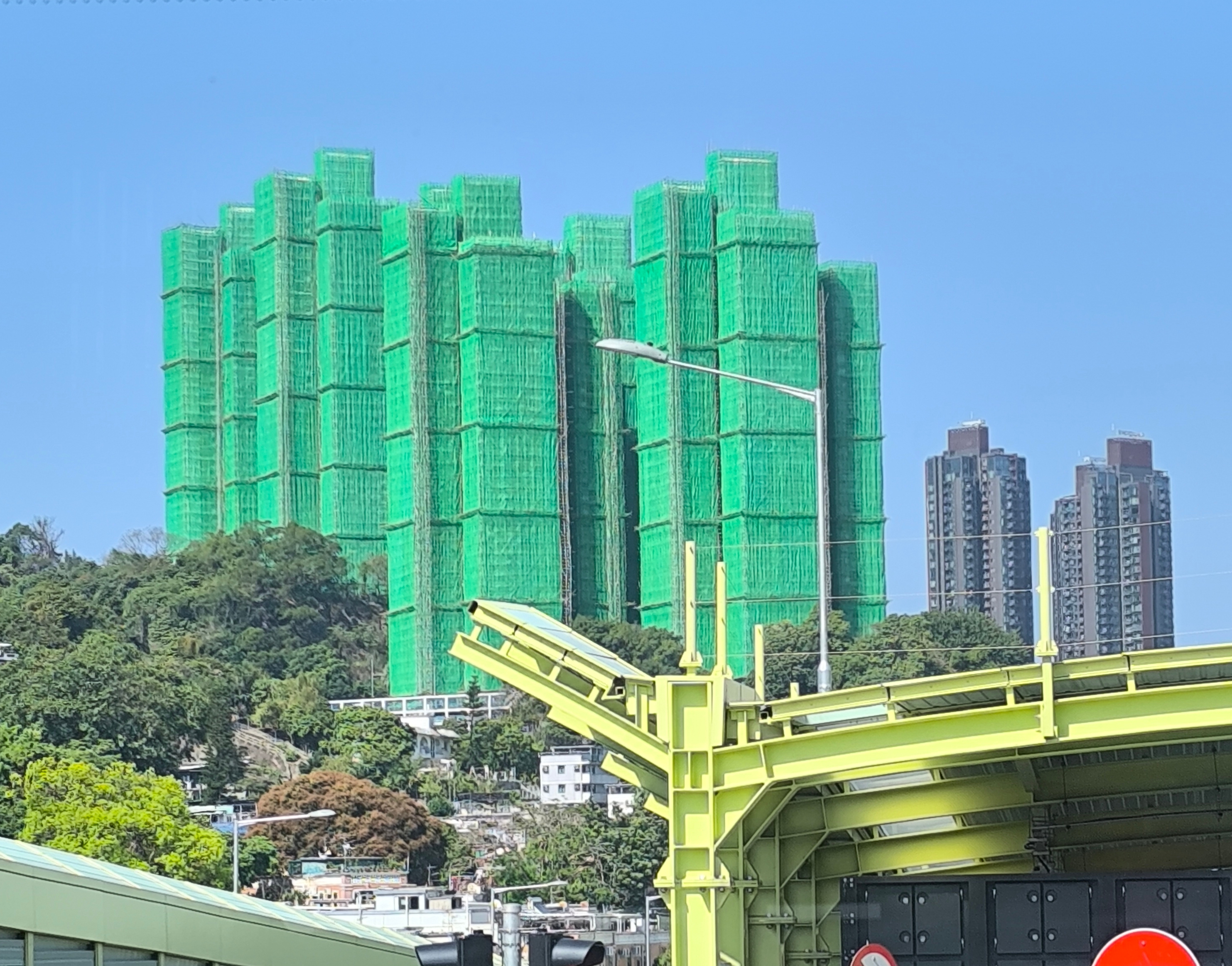 首先,筆者緊急翻查新聞,相信這些棚網是2月中,穗禾苑透過建造業議會安排集體採購的具阻燃功能的新棚網。當時沙田區議員鄧肇峰在社交平台指,穗禾苑9座樓中,其中3幢在拆除棚網後,已改用吊船進行餘下外牆修葺工序。換言之,無須再圍網,由讀者提供的相片,亦見僅6座圍着綠色新棚網。