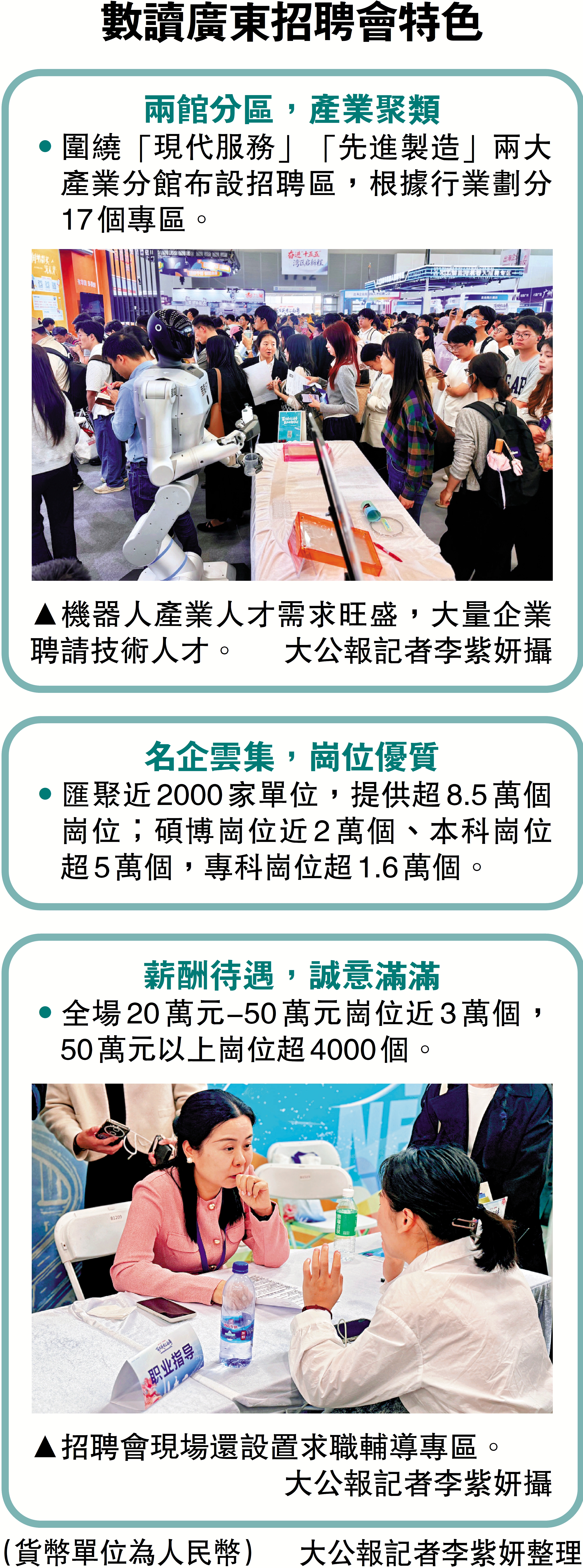 (大公報記者 李紫妍 廣州報道)3月15日至16日,「百萬英才匯南粵」2026年春季大型綜合招聘會在廣州舉行,匯聚近2000家機構,提供超8.5萬個崗位,其中年薪20萬元(人民幣,下同)以上崗位超2萬個,百萬年薪以上崗位近200個,現場並設國際人才專區,被稱作廣東「最強春招」。
