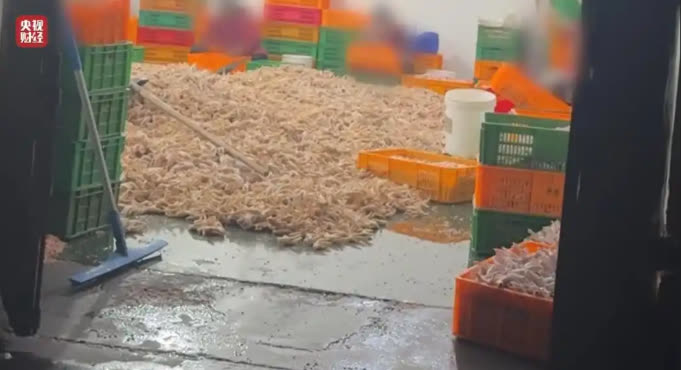 在食品加工車間現場,泡製區、修剪區、挑選區臭氣瀰漫,刺鼻的腥臭味讓人作嘔,生產環境髒亂不堪:地面長期淤積着渾濁污水,各類塑料筐雜亂無章隨意堆放,生產機械設備表面污漬厚重、油污遍布。大量雞爪直接裸露堆放在潮濕骯髒的地面上,即便雞爪被人員踩踏,工人也只是隨手撿起,直接放回加工筐中繼續使用,完全無視食品衞生安全。