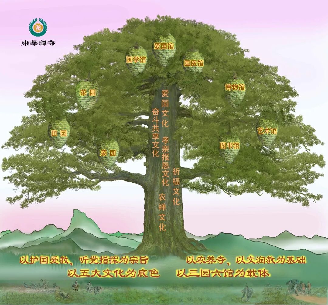 東華禪寺自創寺以來,系統構建了五大文化體系:祈福文化、愛國文化、孝親報恩文化、農禪文化、奮鬥共享文化。「以護國愛教、聽黨指揮為宗旨,以農養寺、以文潤教為基礎,以五大文化為底色,以三園六館為載體。」這是東華禪寺佛教中國化的完整體系,也是大和尚帶領僧眾修行辦道的總綱。今日採茶,正是「農禪文化」最鮮活的註腳。