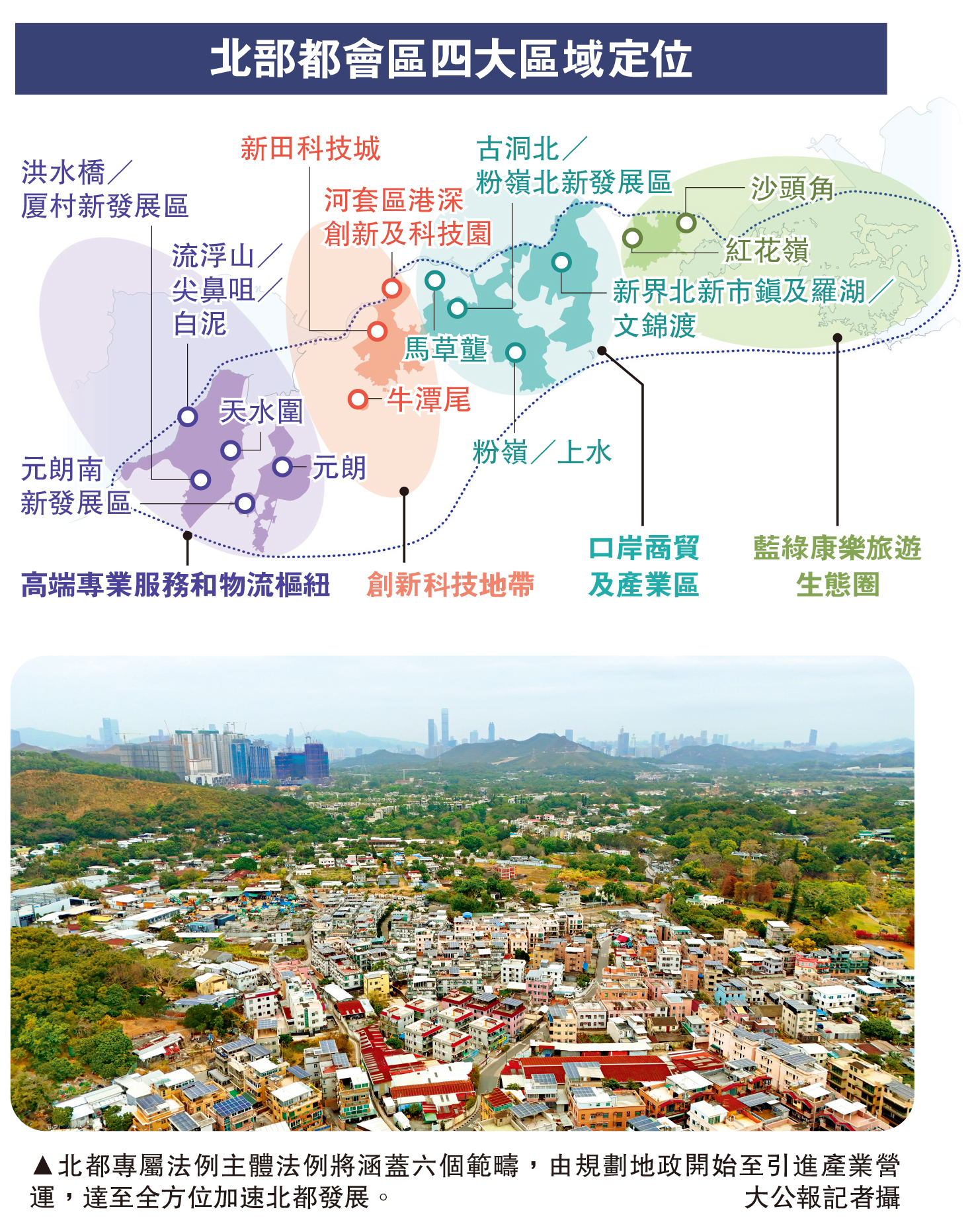 北部都會區是香港未來發展的新引擎,覆蓋元朗區和北區,面積約3萬公頃,約為香港總面積的三分之一。因應不同地區的特色和優勢,北都可分為四大區域,各有不同的策略和產業定位,由西向東依次為高端專業服務和物流樞紐、創新科技地帶、口岸商貿及產業區,以及藍綠康樂旅遊生態圈。