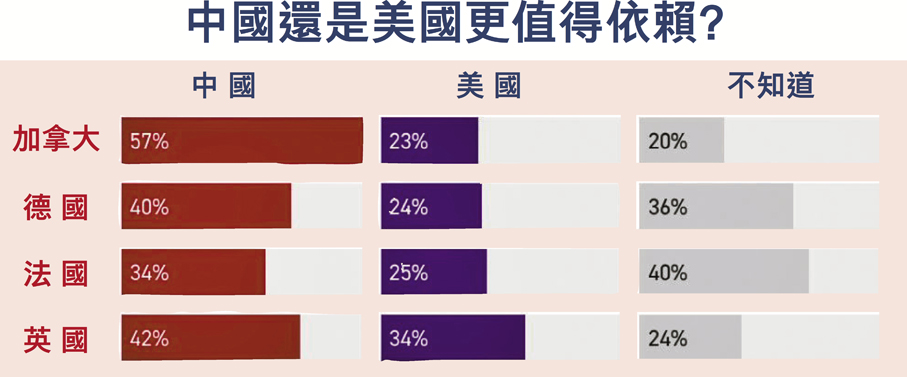 該民調由Politico與英國民調機構Public First合作,於2月6日至2月9日訪問上述4國與美國逾1萬名成年人。民調發現受訪者愈發傾向認為,中國較美國更可靠。被問到應該更依靠中國還是特朗普治下的美國,加拿大、德國、英國和法國分別有57%、40%、42%和34%傾向中國,遠超認為應依靠美國的比例。