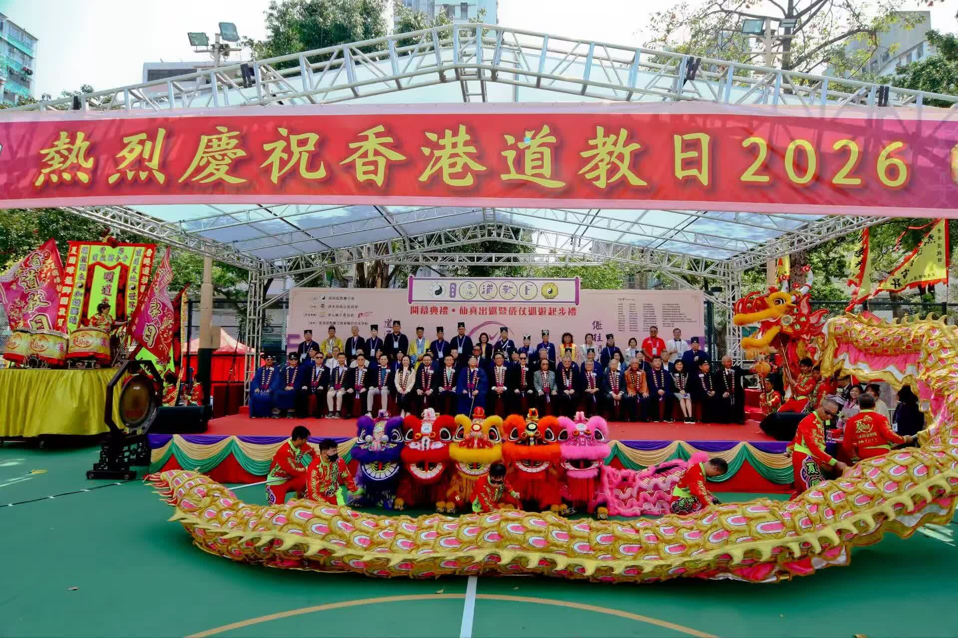 近日,丙午年香港道教日系列活動隆重舉行。香港道教聯合會於深水埗楓樹街遊樂場,先後舉辦了「丙午年香港道教日開幕禮(2026)ㆍ仙真出巡暨儀仗巡遊起步典禮」及「丙午年(2026)香港道教日祈福大巡遊」,場面莊嚴壯觀,為本年度道教日慶祝活動拉開精彩序幕。