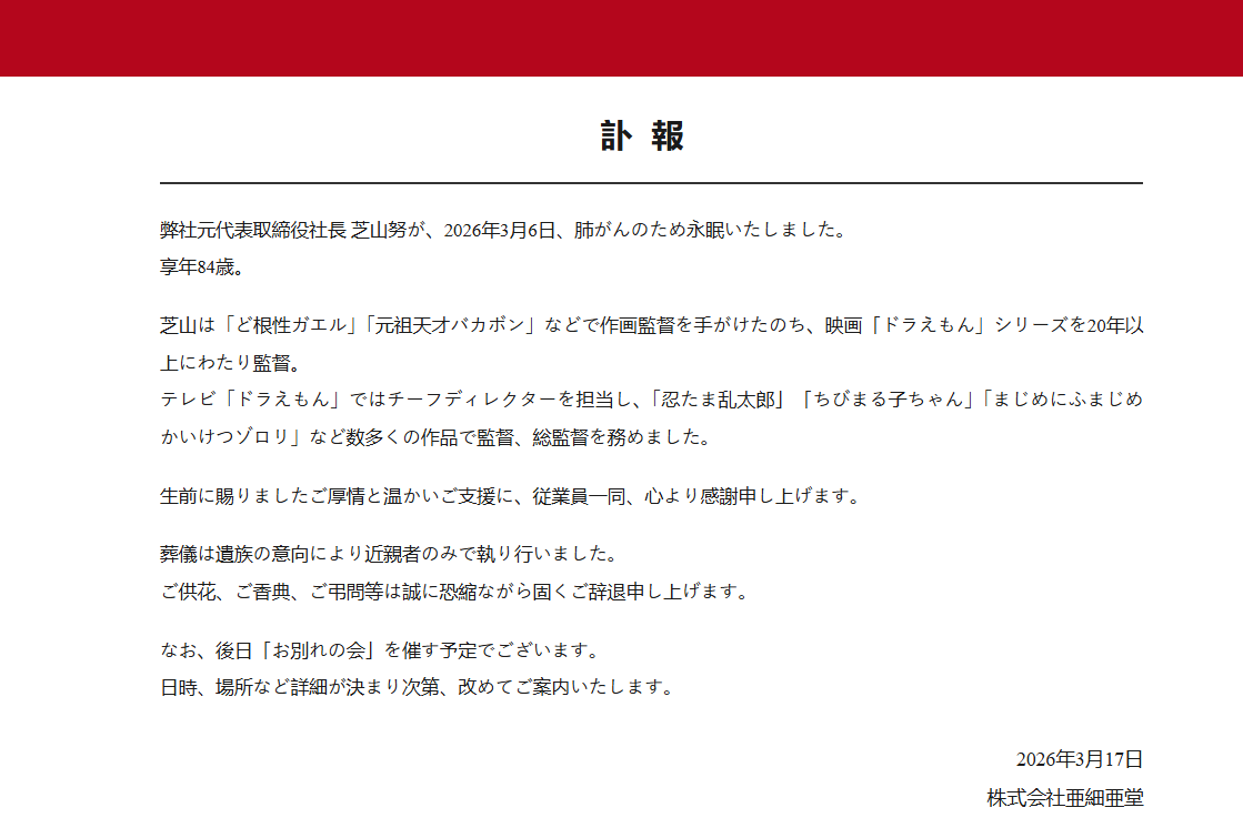 大公文匯全媒體報道,日本動畫製作公司亞細亞堂今日(17日)在官網宣布,曾擔任「多啦A夢」系列電影導演逾20年的芝山努,已於3月6日因肺癌過世,享年84歲。
