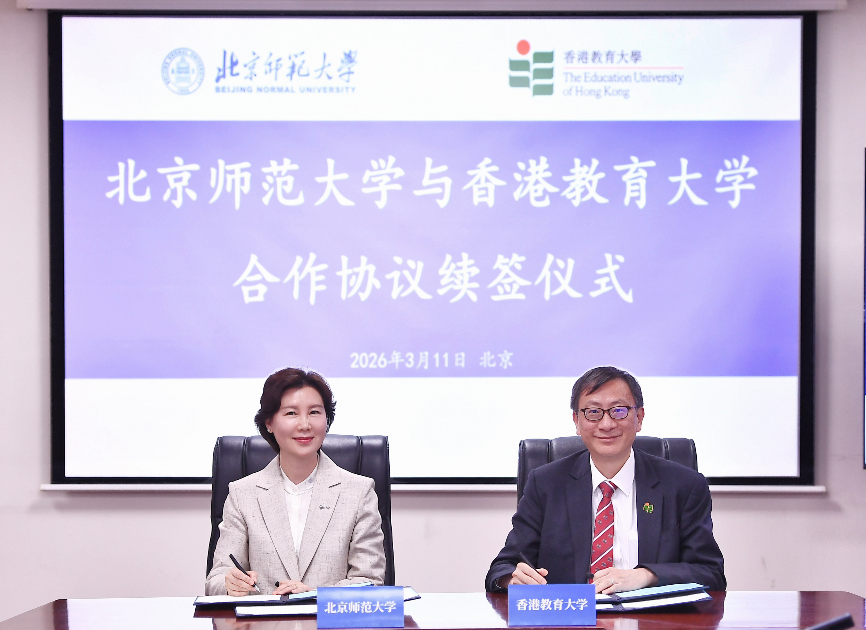 兩位校長代表北師大與港教大續簽合作協議。
