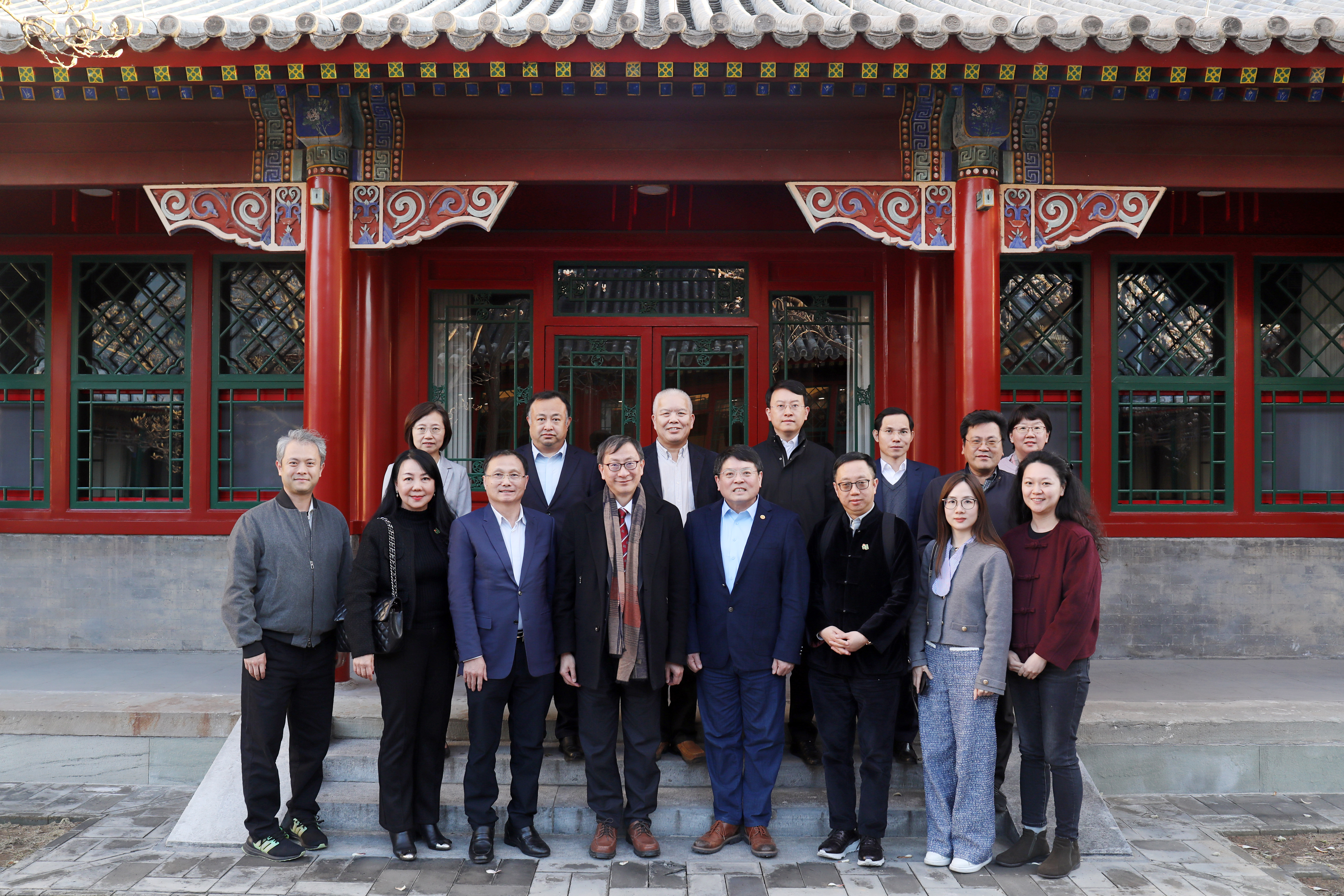 以李子建校長為首的港教大代表團,在奧園集團黨委書記、廣東梓材教育投資集團創始人郭梓寧博士(左三),以及香港大灣區教育資源中心主席陳祺興博士(左一)的陪同下,參觀北京大學校園,並受到北大黨委常委、副校長兼總務長董志勇教授(前右四)及多位學院領導的接待。