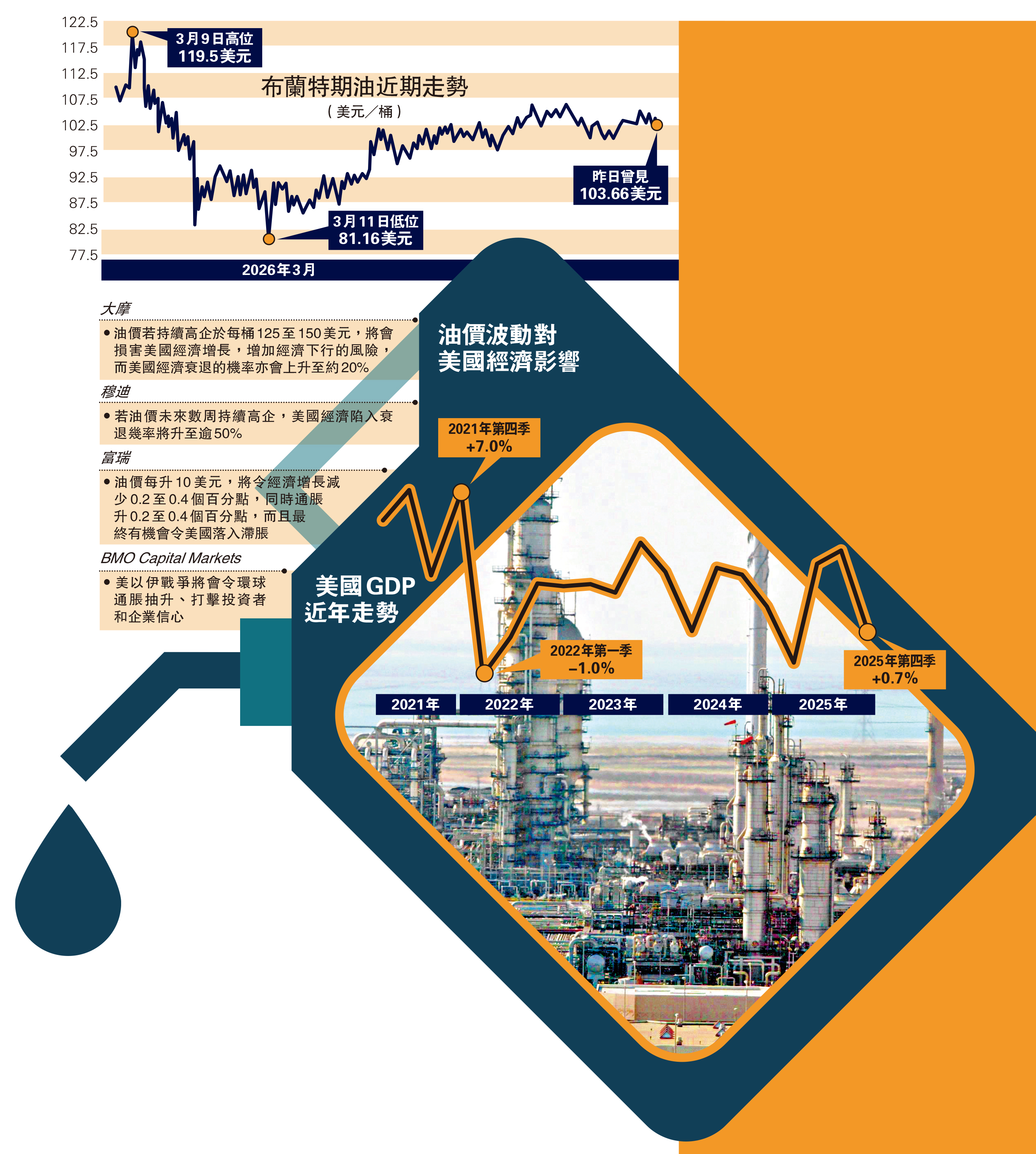 (大公報記者 李耀華)中東戰事衝擊原油供應,評級機構穆迪預測,若油價未來數周持續高企,美國經濟陷入衰退的幾率將升至逾50%。富瑞認為,油價每升10美元,將令美國經濟增長減少0.2至0.4個百分點,同時通脹升0.2至0.4個百分點。投行摩根士丹利相信,若油價繼續急升,美國經濟衰退幾率將升至約20%。