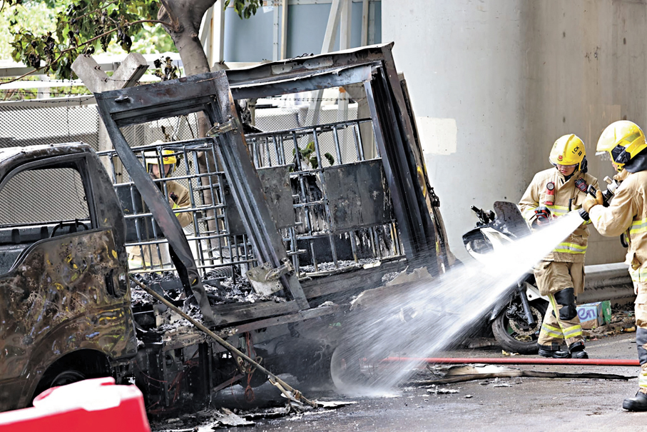 消防處助理消防區長(危險品執法)黃文健昨日表示,昨午2時09分接到火警報告,消防員3分鐘內抵達現場,2時16分將火救熄。火警中,消防處共調派一輛消防車、一輛救護車,出動6名消防人員及3名救護員,動用一喉及一隊煙帽隊灌救。火警致令一輛輕型貨車和兩輛電單車被焚,消防員發現懷疑易燃液體燃燒的痕跡,並在嚴重焚毀的輕型貨車上檢獲兩個油缸、油喉及油槍等加油工具,有理由相信涉事輕型貨車經非法改裝為非法流動加油站。