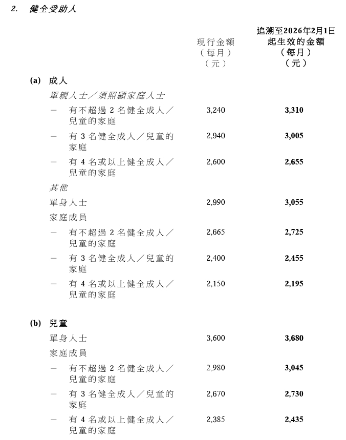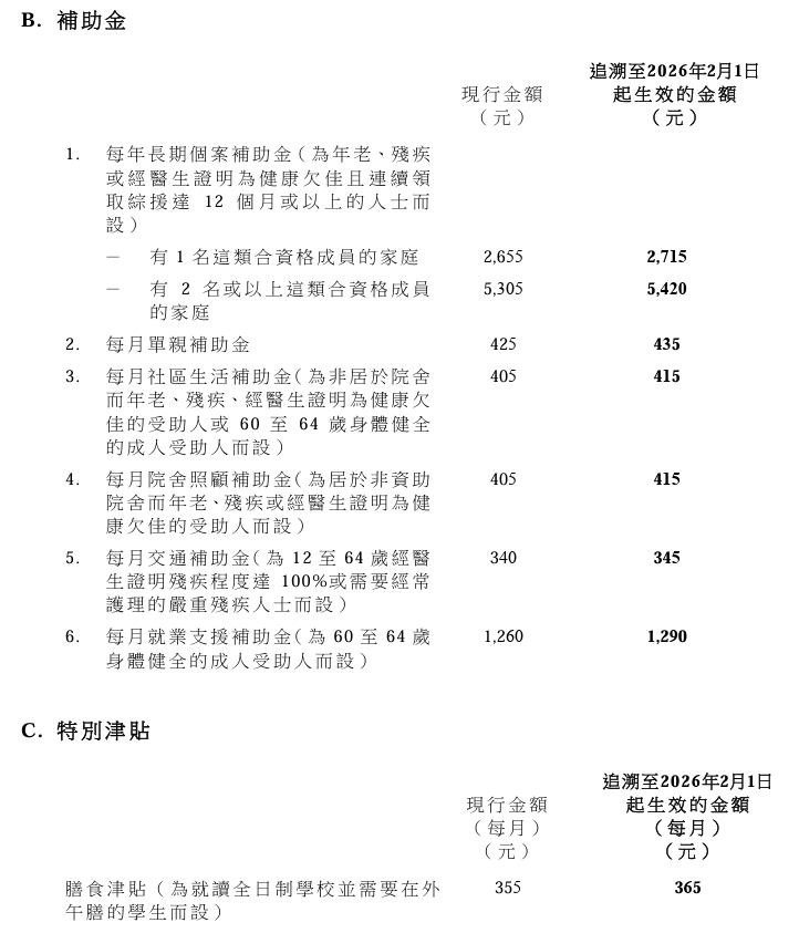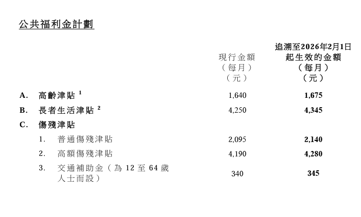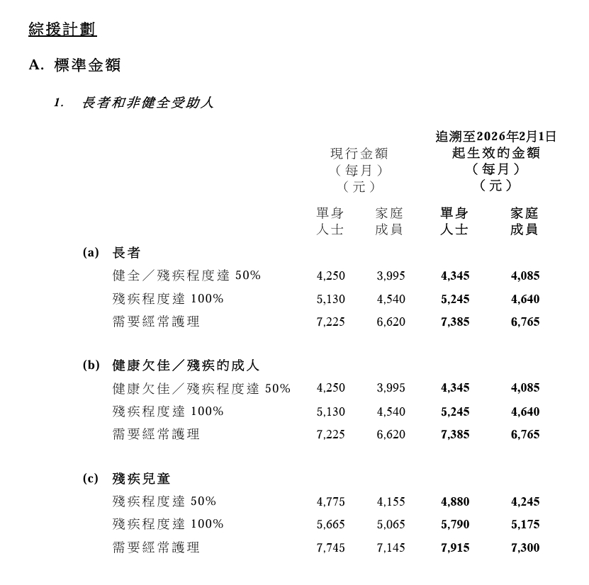 大公文匯全媒體報道,社會福利署今日(18日)公布,綜合社會保障援助(綜援)計劃的標準項目金額,以及公共福利金計劃(即高齡津貼、長者生活津貼和傷殘津貼)津貼金額的按年調整,會追溯至今年2月1日起生效。