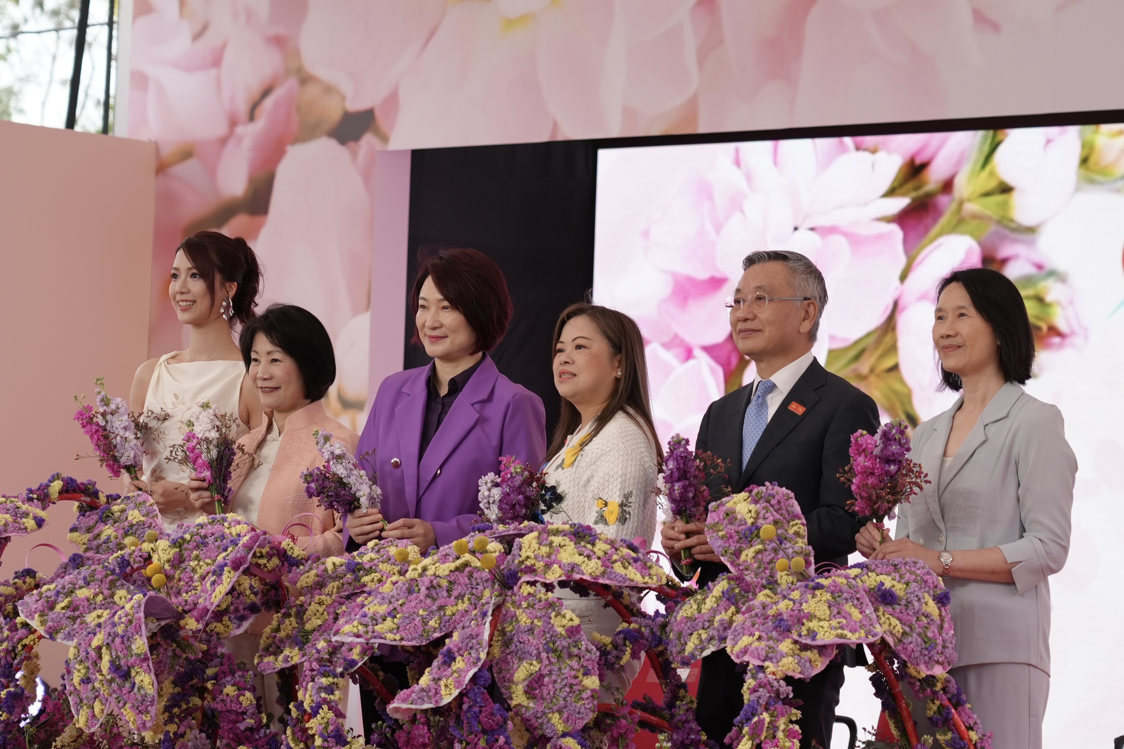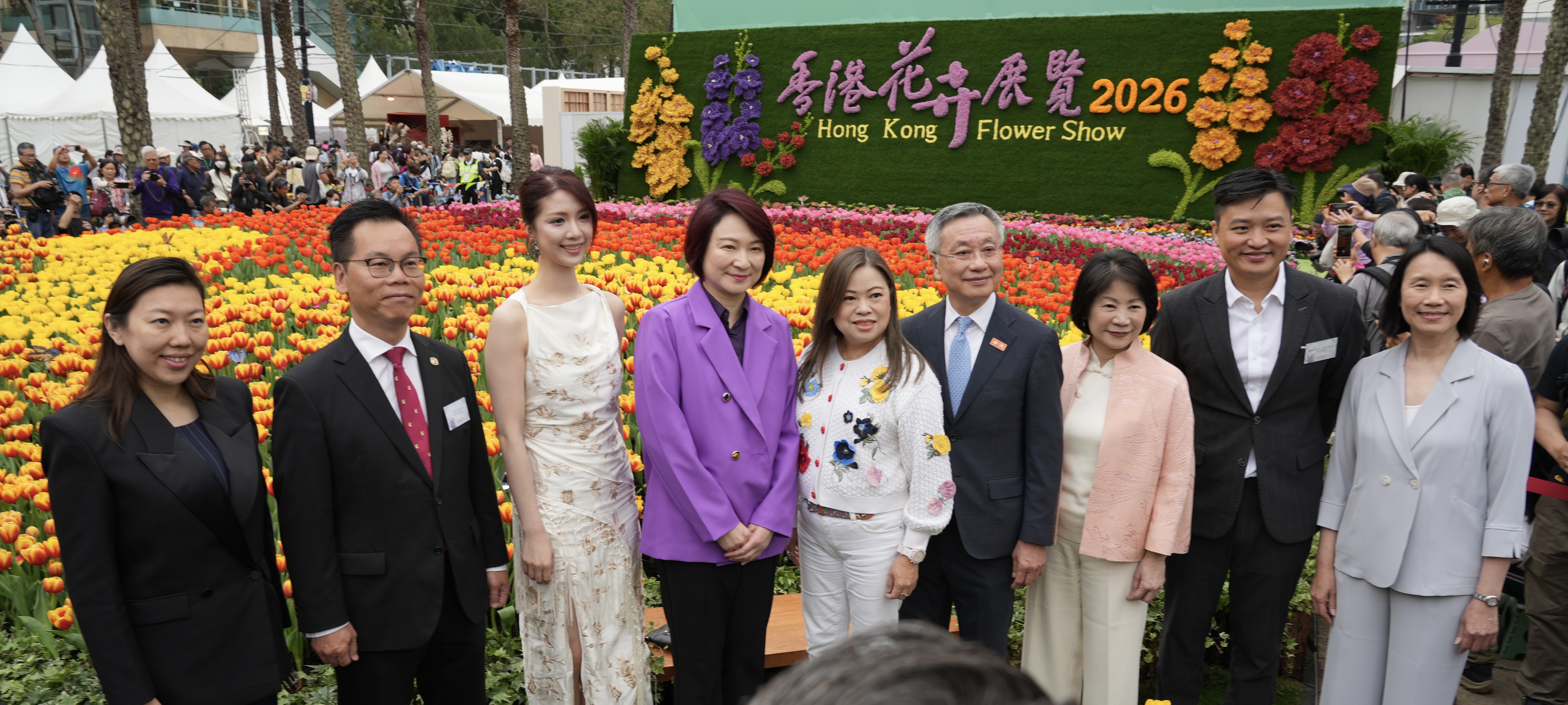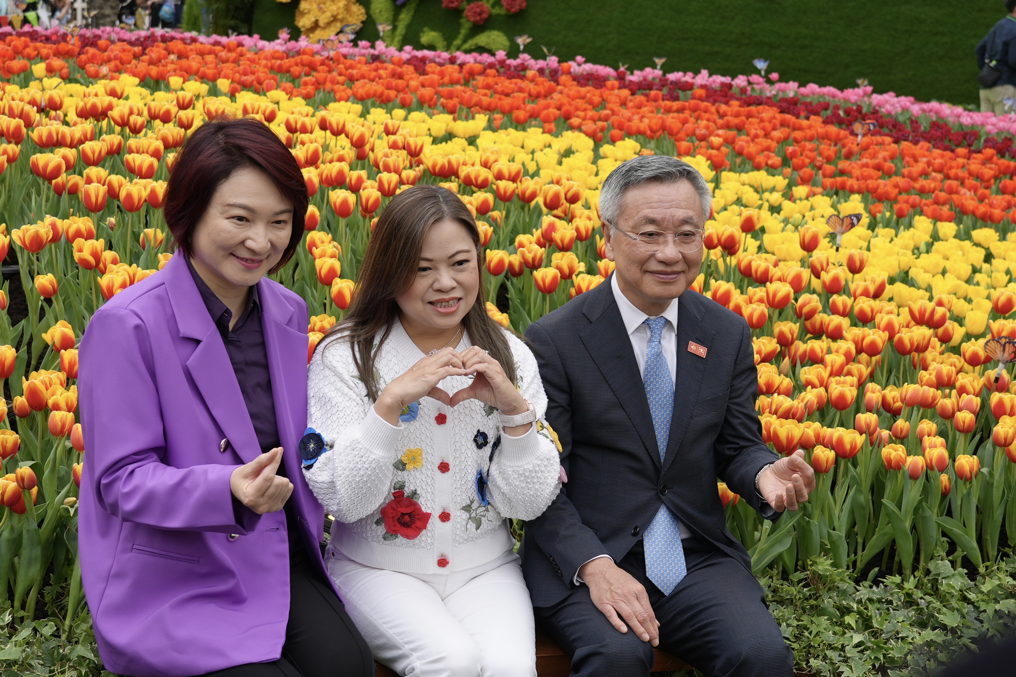 典禮後,各嘉賓隨即遊覽花展,李慧琼、羅淑佩及羅啟華在巨大花卉前比心合影,盡現親民一面。
