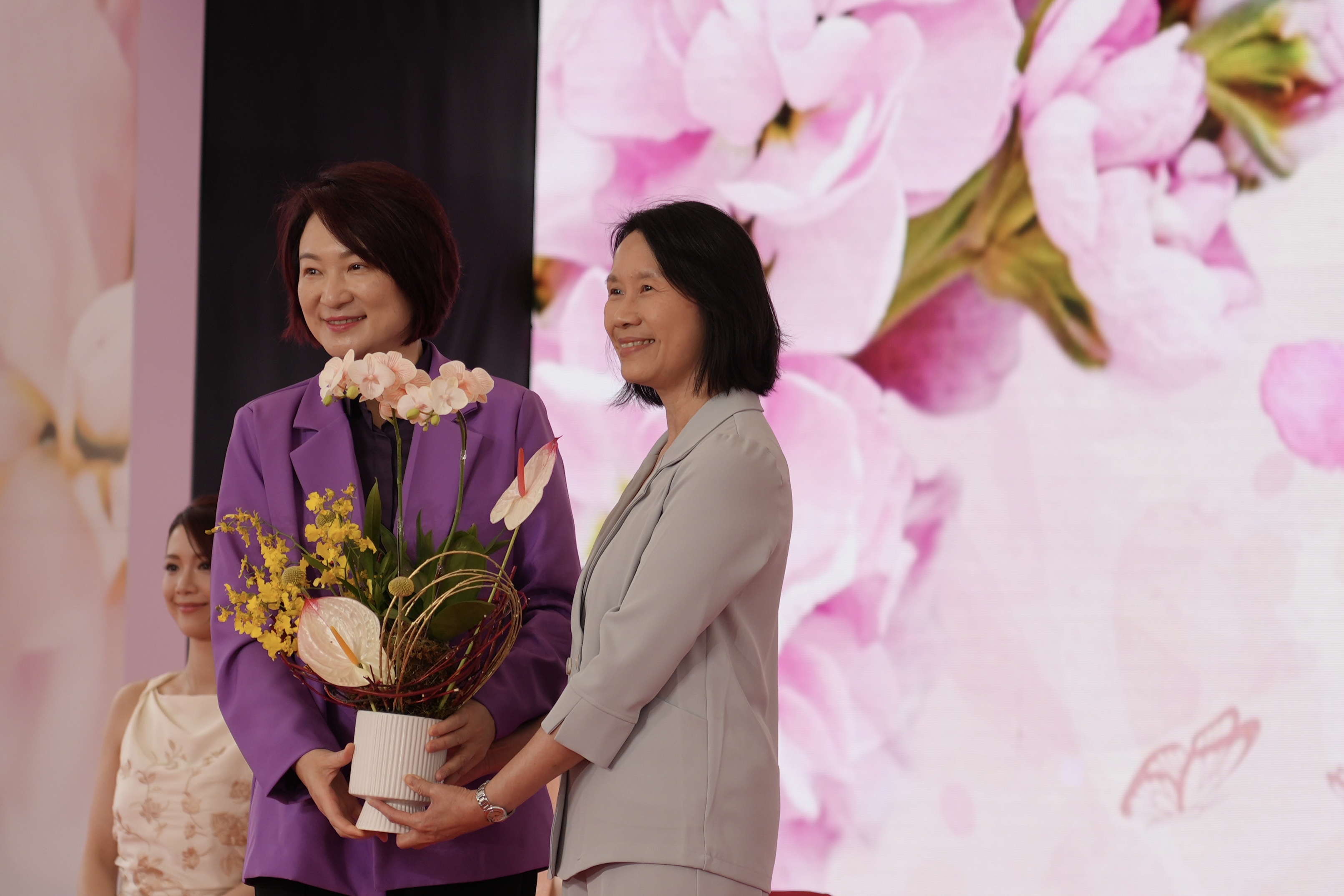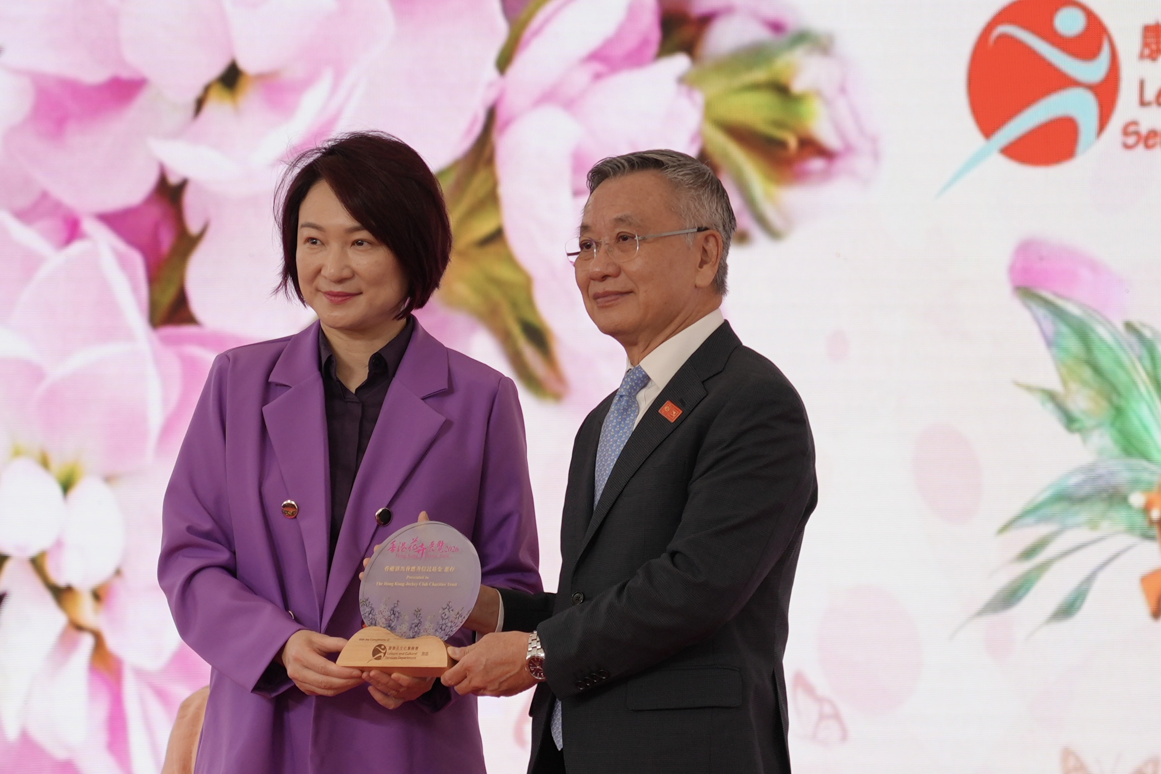立法會主席李慧琼今日亦應景身穿紫色套裝,分別為香港賽馬會董事羅啟華,康樂及文化事務署署長陳詠雯送上紀念品,以祝花展圓滿舉行。