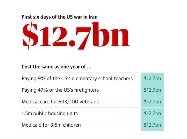 - 2月28日,美軍一枚戰斧導彈擊中伊朗一女子小學,造成175人死亡。單枚戰斧導彈造價約350萬美元。據估算,戰爭前六日美軍已發射超過300枚戰斧導彈,總耗資12億美元。美軍官員稱,截至第六日已打擊2500餘個目標。僅進攻性打擊彈藥的估算成本就達55億美元。