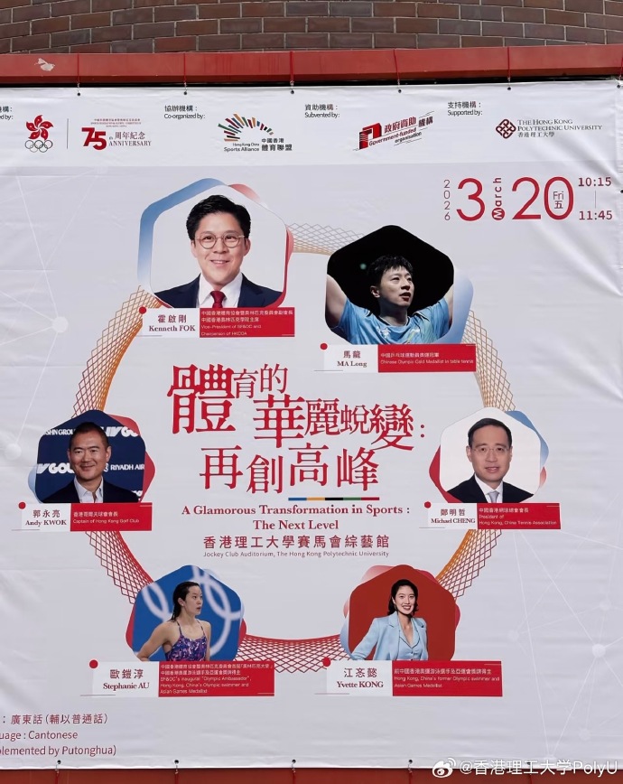 大公文匯全媒體報道,乒乓球奧運冠軍馬龍訪港,與香港青年學生交流,今日(20日)上午到訪香港理工大學,參加名為「體育的華麗蛻變:再創高峰」講座,同場嘉賓還有霍啟剛、郭晶晶夫婦,香港女子游泳運動員歐鎧淳、江忞懿等。
